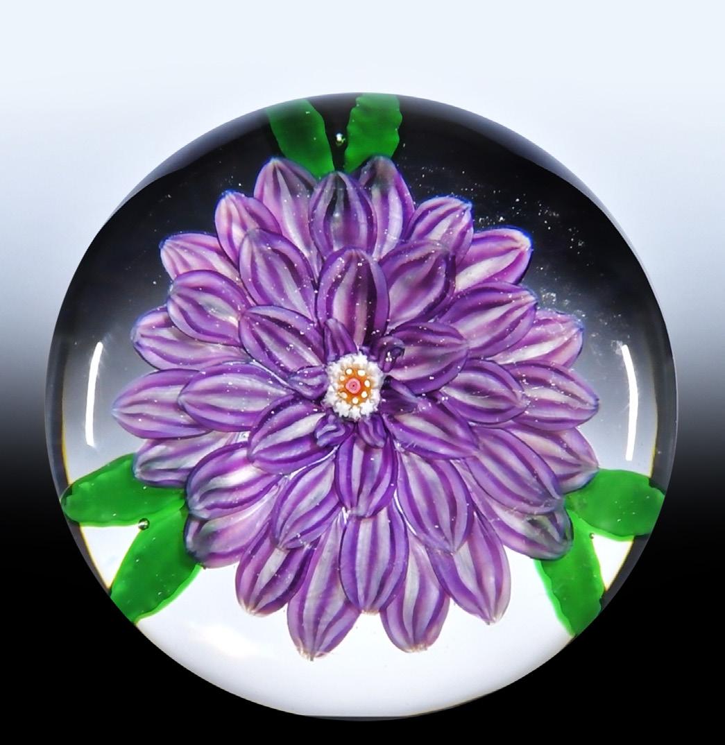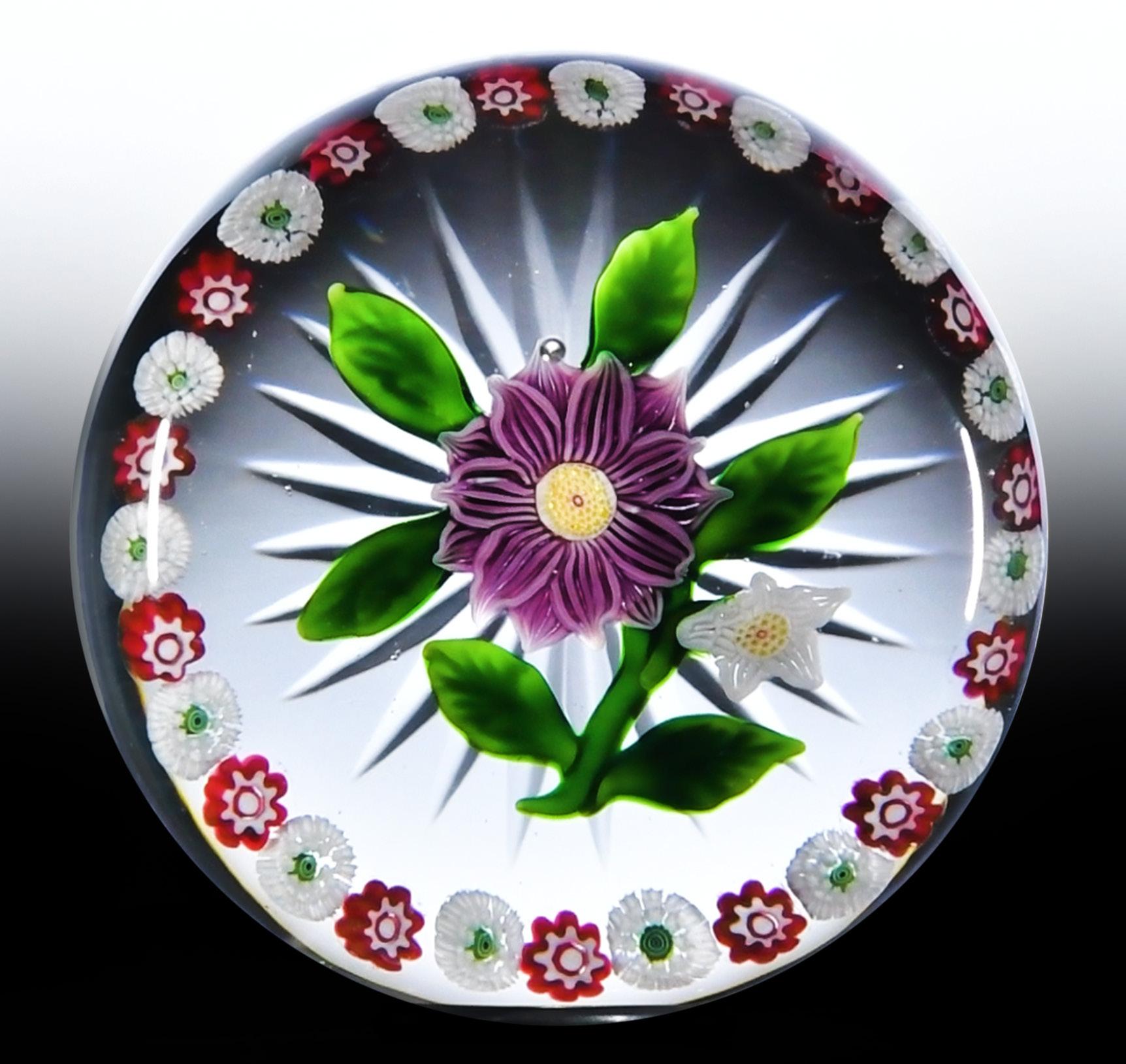 106 Unusual Baccarat three-colored pink, amethyst and blue pompon with millefiori garland paperweight. A beautiful pompon flower, with tiers of C-shaped petals in a surprising and unusual combination of salmon-pink, cobalt blue and pale purple, has a yellow and white stardust cane center and a halo of five crenulated green leaves. It is joined by a lovely blue companion bud below, sharing a curving stem with three more leaves. A garland of alternating white and green canes borders the design. Star-cut clear ground. A similar example sold in the L.H. Selman Ltd. Fall 1996 15th Auction as lot 66.