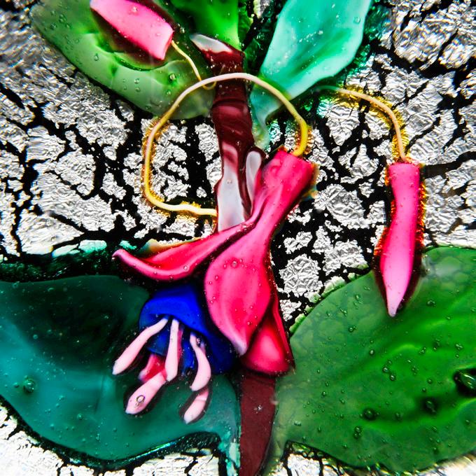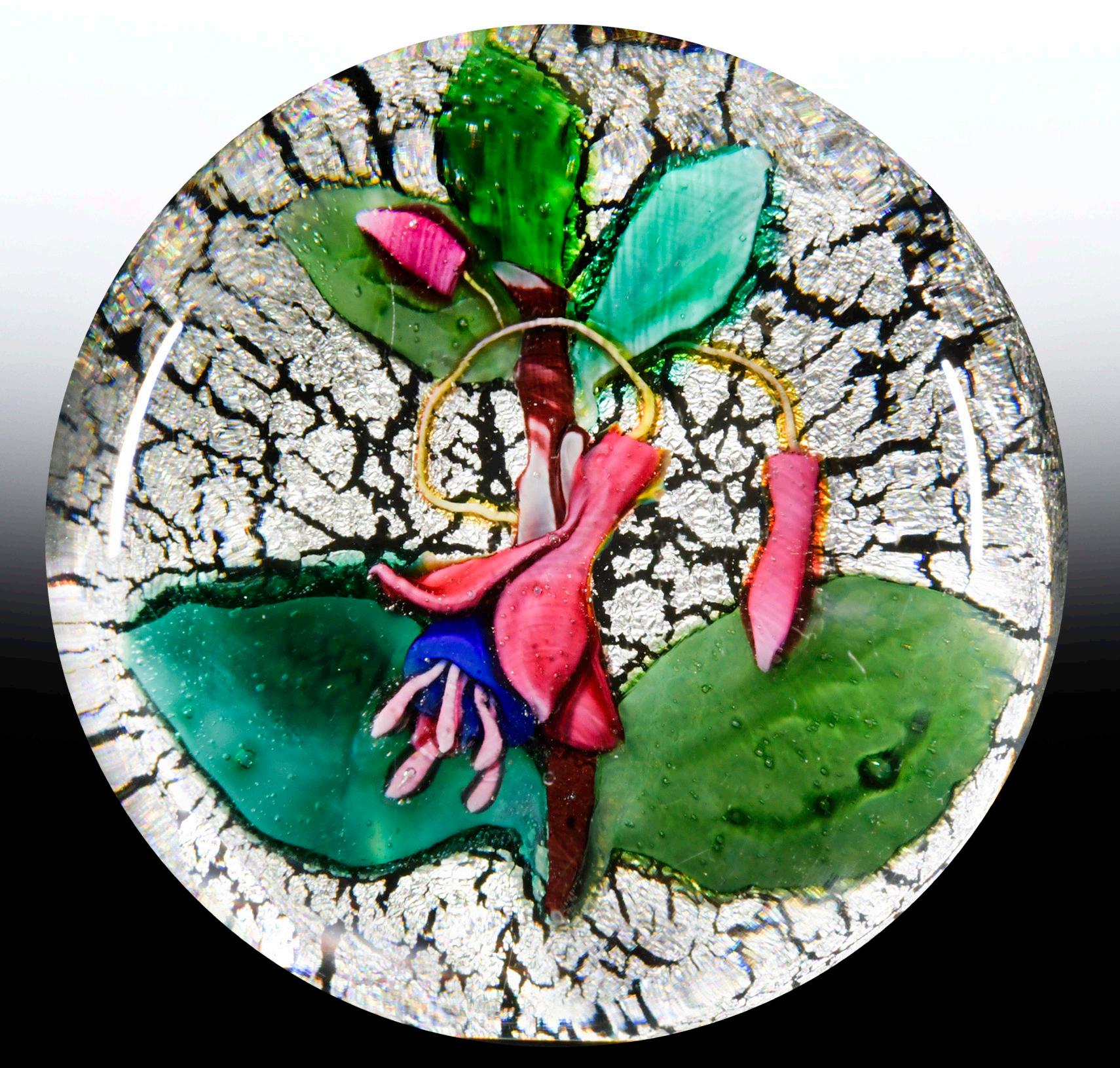 1 Spectacular and extremely rare antique Pantin fuchsia on silver-foil ground paperweight. A stunning dimensional fuchsia flower has a bell of three flared pink sepals cupping a cobalt blue inner layer, with a cluster of trailing pink stamens, as it connects to a short brown branch by a thin yellow stem, along with two companion pink buds and five contrasting leaves in different hues of green. A blanket of fine air bubble dew glistens over the flora, which rests on a shimmering silver-foil-over-clear ground, adding a scintillating effect to this already spectacular design. Pictured and discussed in “Presse papier de cristal: panorama des collections françaises”, plate 36. Fine condition. Diameter 3 1/8"