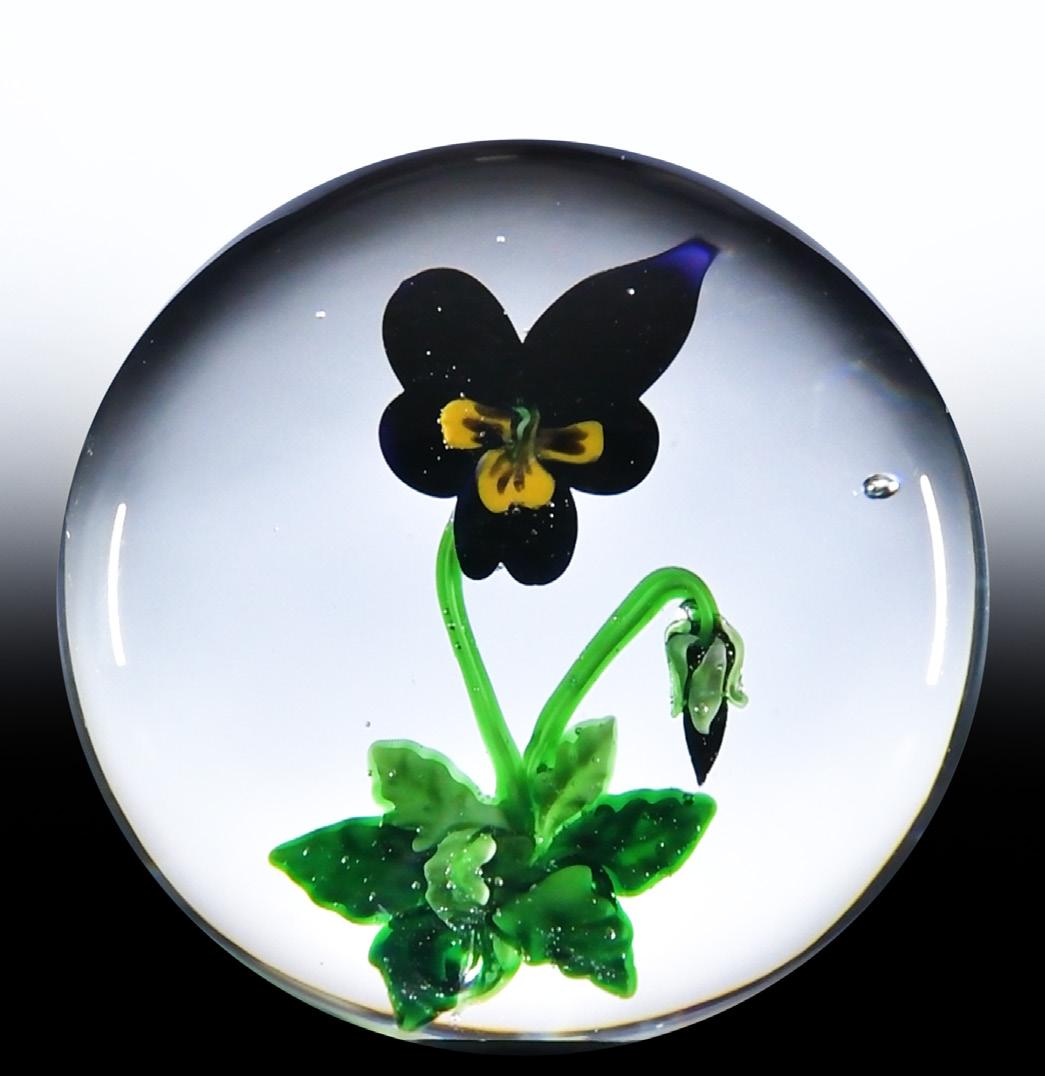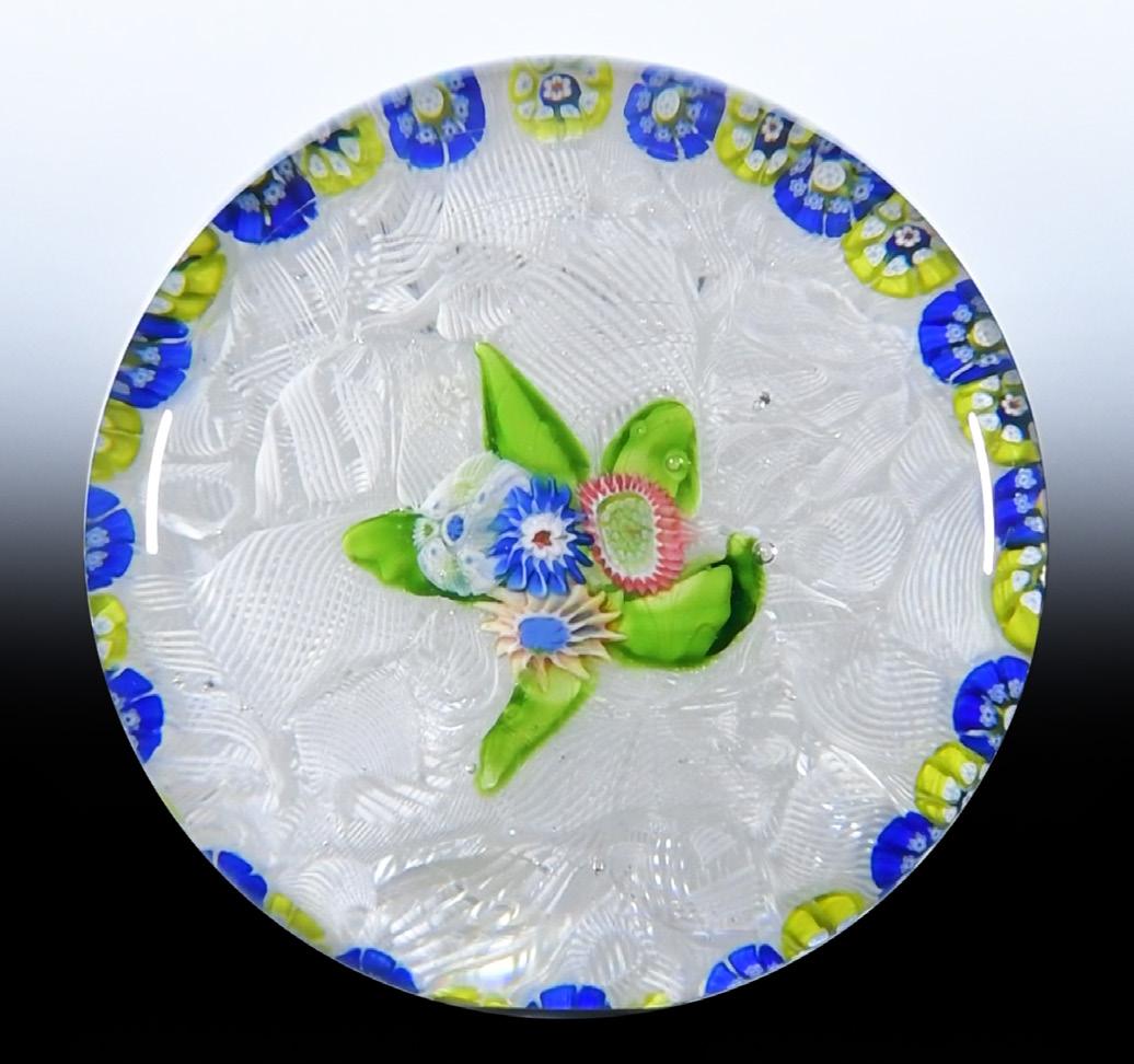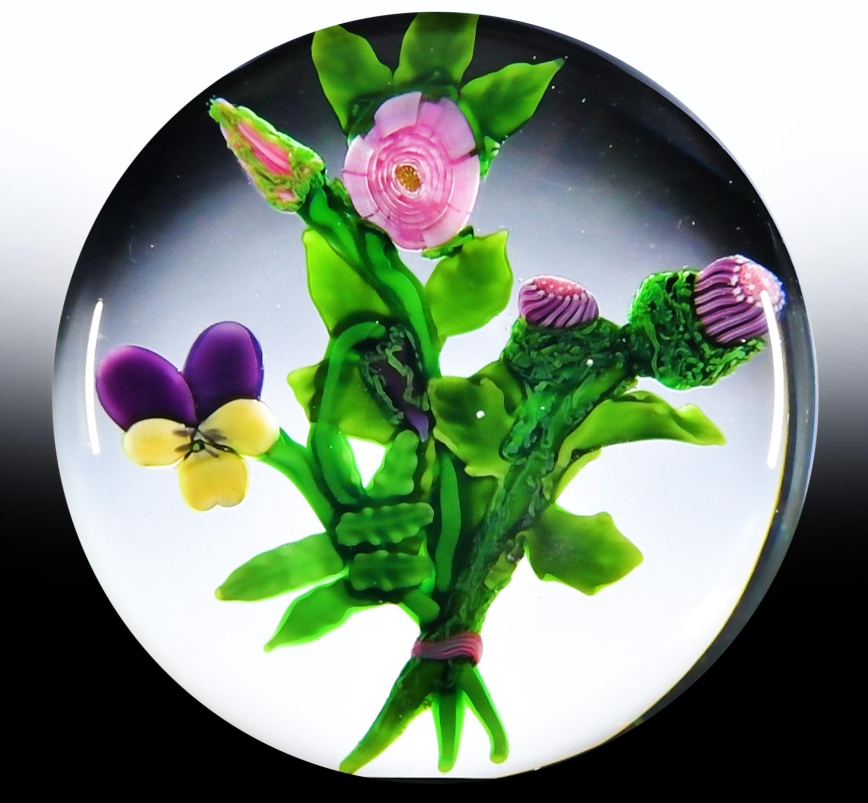 38 Rare antique Clichy rose, pansy and thistle bouquet paperweight. A large yellow-centered pink millefiori rose, cupped by sepals and crowned by three leaves, tops a bouquet along with a sheathed companion bud. A purple and pale yellow pansy appears to its left, also with a companion bud and a set of thin leaves, and a pair of rarely seen thistles appear on the right, each fashioned from a long purple, pink and white complex cane and cupped by thick green rings of spurs, which also cascades down their stems, flanked by wide serrated leaves. The blooms are gathered by the stems and tied with a striped pink ribbon. Clear ground. Similar arrangements of flowers are known, perhaps suggesting a commemoration of the alliance between England, Scotland and France during the 1853-1856 Crimea War. “A thought-provoking assembly of blossoms and buds by Clichy, simple at first glance, expresses unrequited love...The minute detail of buds with green sepals and stems, loosely tied with pink ribbon, make this an artful interpretation of a symbolic bouquet.” —Glass Paperweights in the Art Institute of Chicago. A similar example was sold in LH Selmans Auction 43 as lot 3.