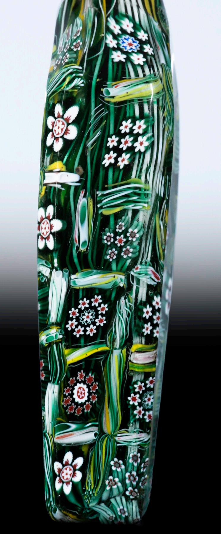 5 Very rare antique Clichy millefiori carpet ground in a stave basket with signature cane paperweight. Delicate white stardust canes, with red bull’s-eye centers, create a prairie where varied and colorful millefiori canes are laid in spaced concentric rings, including a signature cane. The field of flowers is held in a green and white stave basket. “Ten stardust grounds have been documented from Clichy.” —The Dictionary of Glass Paperweights . Fine condition.