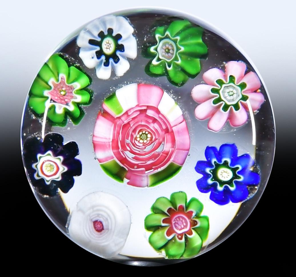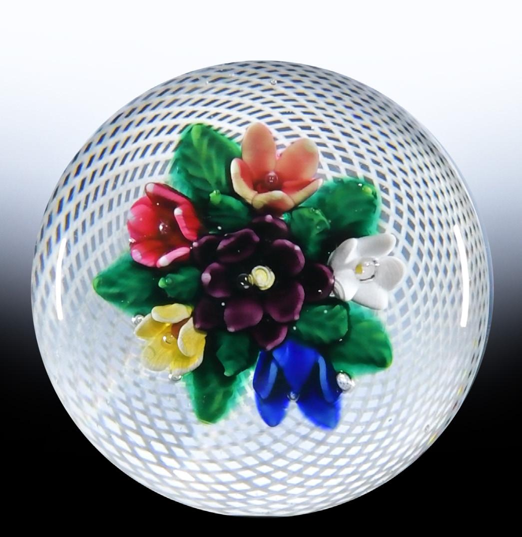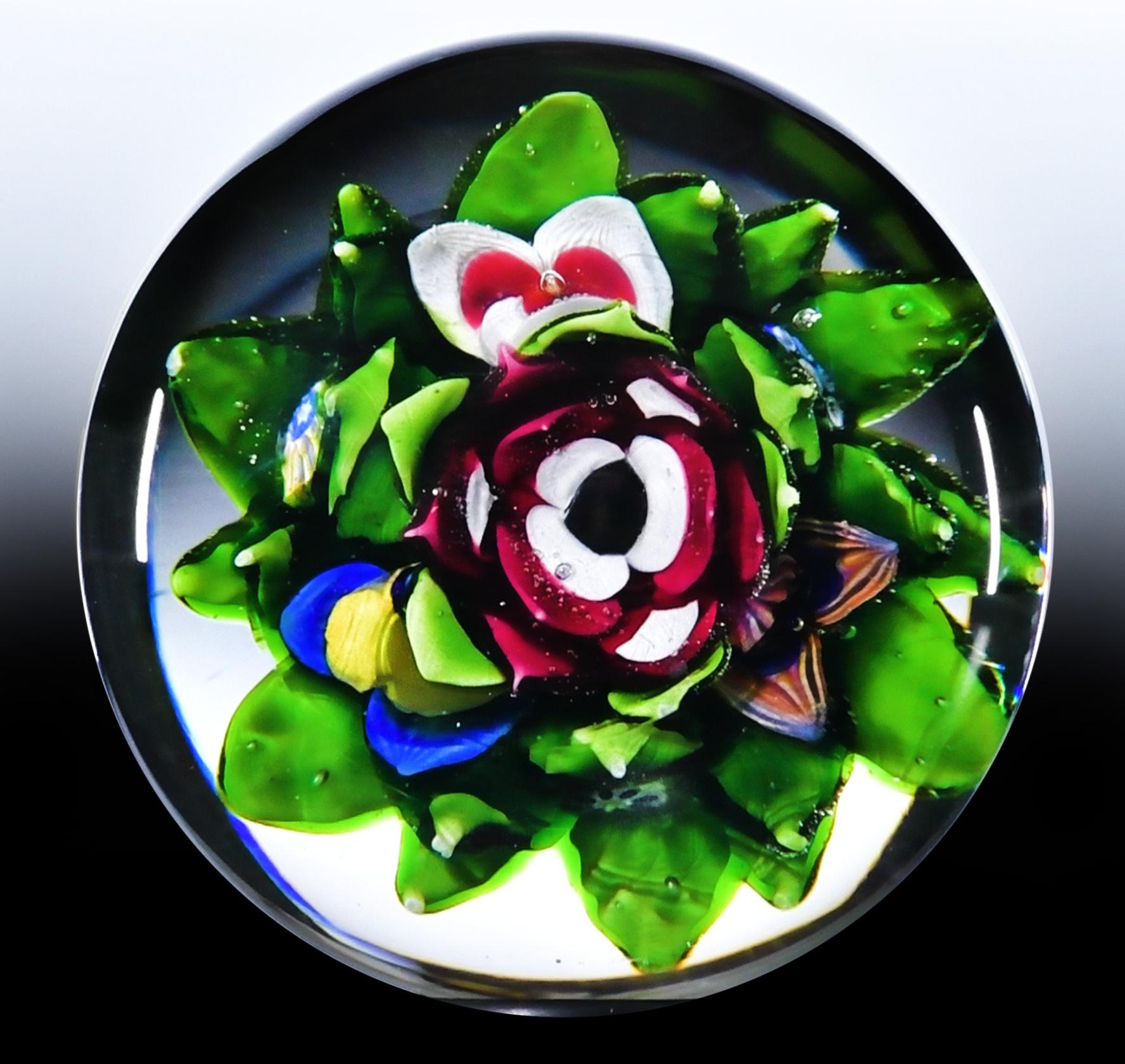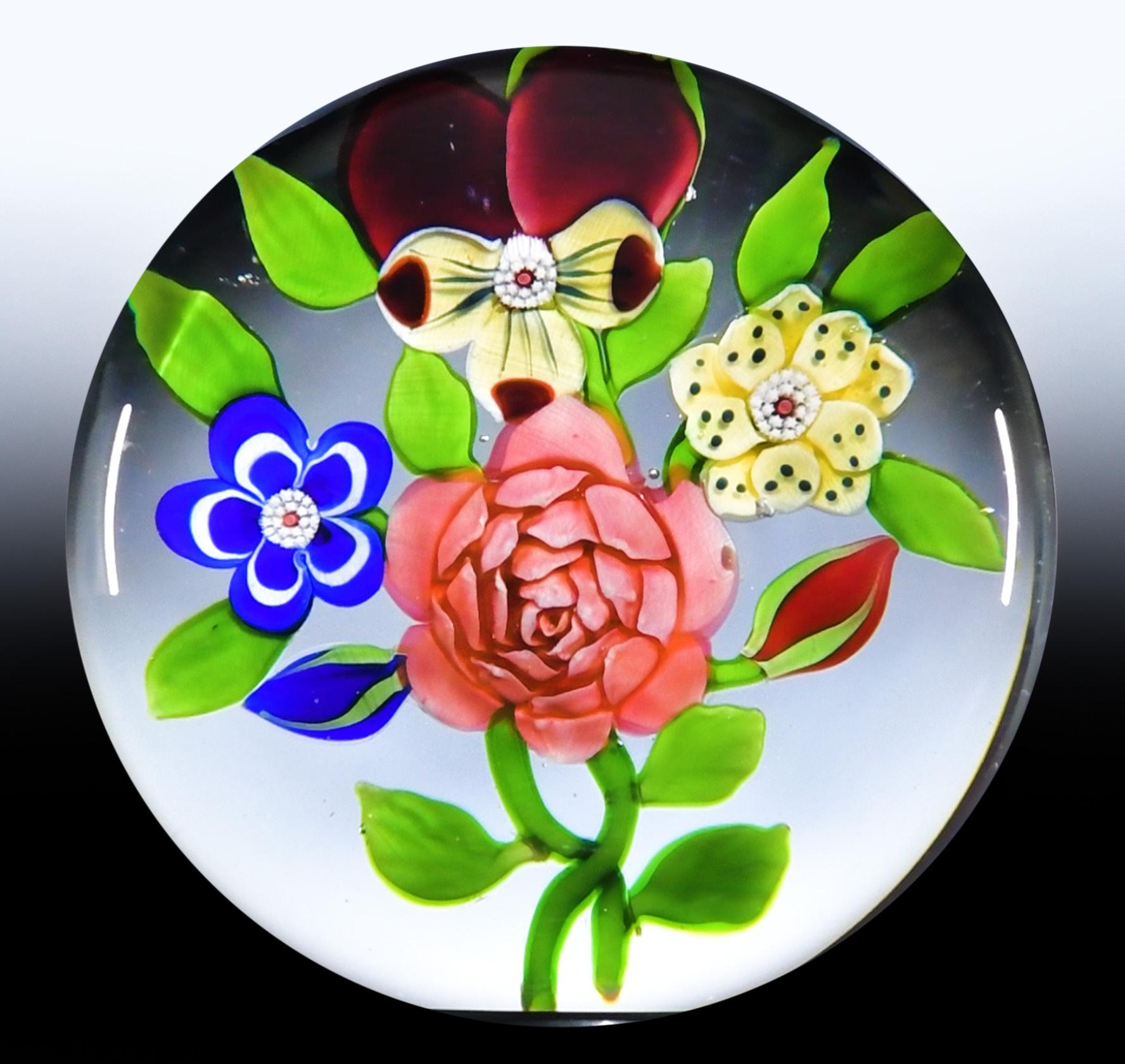104 Rare antique Baccarat four-flower bouquet with “thousand petal” pink rose paperweight. A lush pink “thousand petal” rose blooms at the heart of a formal bouquet and is haloed by a blue and white primrose, a Type III pansy and an uncommon spotted yellow wheatflower, each of which is centered by a white stardust and red bull’s-eye cane. Two intertwined stems, a blue bud, a red bud and a scattering of green leaves complete the bouquet. Clear ground. “Large multifloral bouquets were a specialty of Baccarat and displayed the highest degree of skill in lampwork, and millefiori techniques.” —Baccarat Paperweights and Related Glass: 1820-1860. For similar examples, see Paperweights: Flowers Which Clothe the Meadows, page 75, figure 64, and Baccarat Paperweights: Two Centuries of Beauty, page 104, figure 338.