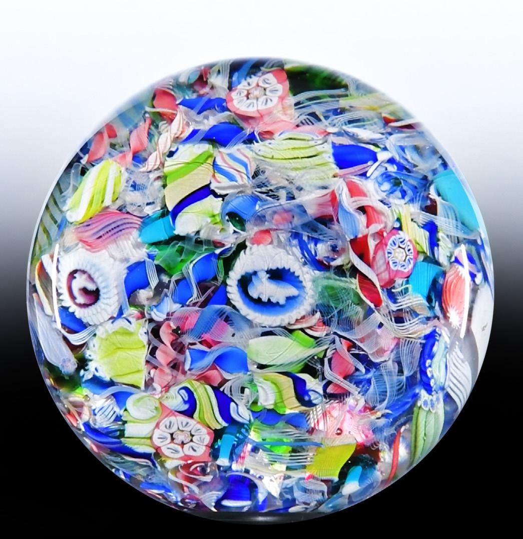 72 Rare antique Venetian 1845 scrambled millefiori and Franchini murrine paperweight. A fanciful assortment of brightly colored latticinio and aventurine ribbons, as well as some of the earliest examples of Franchini canes, including the portrait of a woman with roses in her hair, a gondola, a draughtsboard, a rose within a ribbon-tied wreath, an anthropomorphic sun, a long-stemmed rose, an 1845 date cane, a GBF (Giovanni Battista Franchini) signature cane and a FA initials cane, contribute to the intrigue of this exceptional and historical example of Italian paperweight design. Fine condition and typical internal flaws.