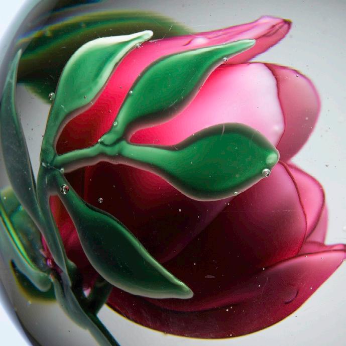 14 Rare antique Mount Washington pink rose and buds magnum paperweight. A large pink-shaded rose, with tiers of cascading petals, is flanked by two companion buds, each cupped by green sepals and emerging from a sturdy stem, and is crowned by a halo of five dew-studded green leaves. Clear ground. Good condition and internal flaws, with rough pontil mark.