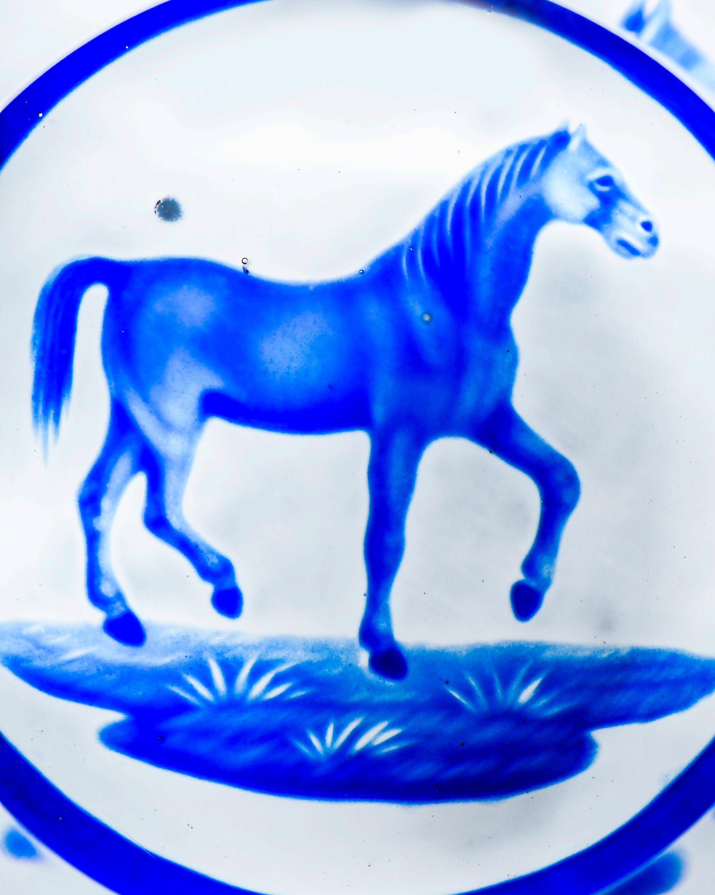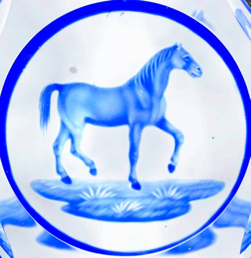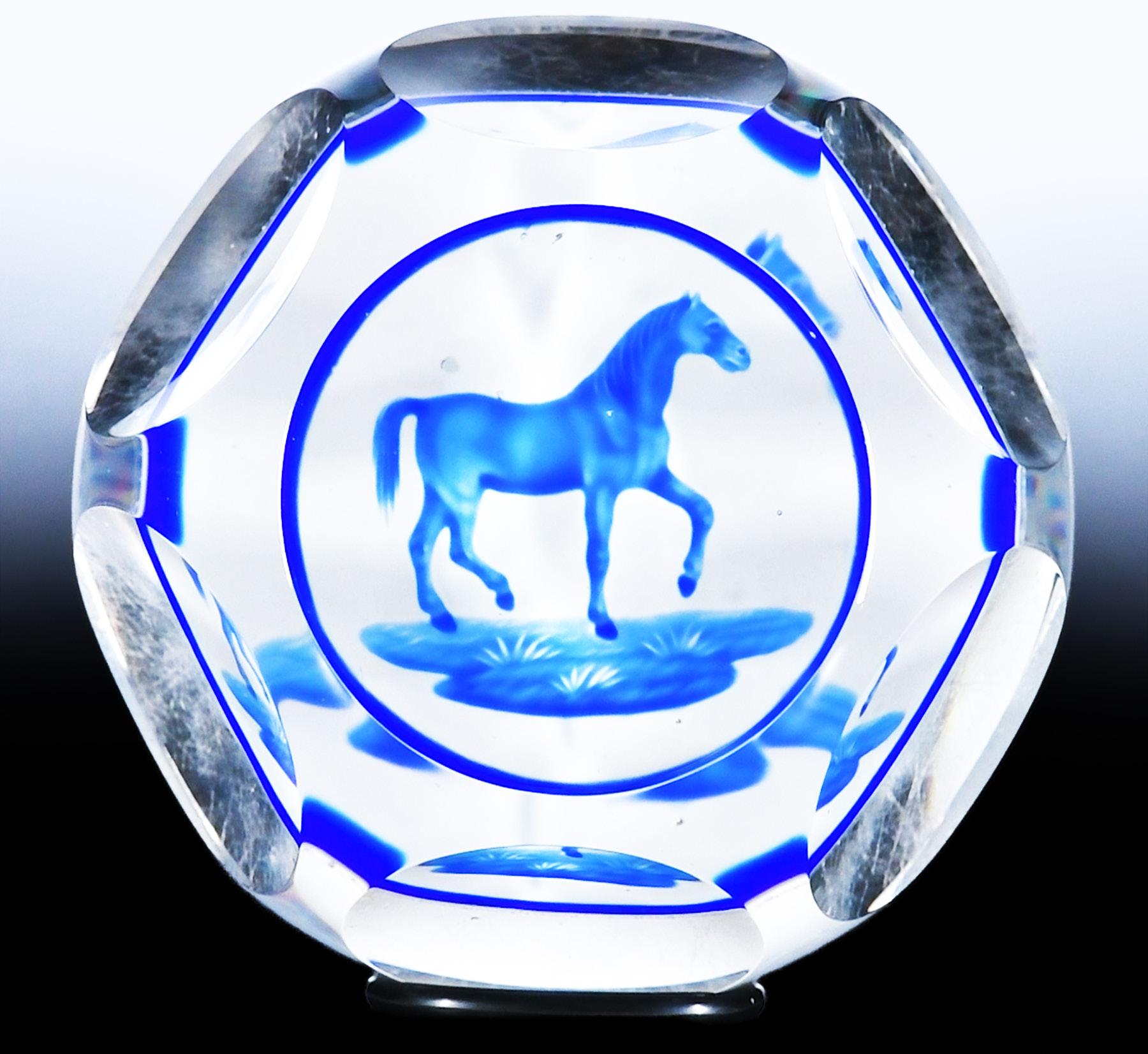 4 Exceptionally rare antique Baccarat blue intaglio prancing horse faceted paperweight. One of only nine known horse plaque examples and just one of just three that are of this image, a blue intaglio carved horse stands with a lifted foreleg and hind leg on a patch of ground that shows atop a white plaque, rimmed in blue. The plaque floats within a clear ground with six round side facets and one top facet. “Roughly a dozen classic period paperweights exist which use the cameo carving technique made famous by Bohemian, English, and later, French glassworks. Ten of these were made by Baccarat.” —Baccarat Paperweights: Two Centuries of Beauty, page 64.
