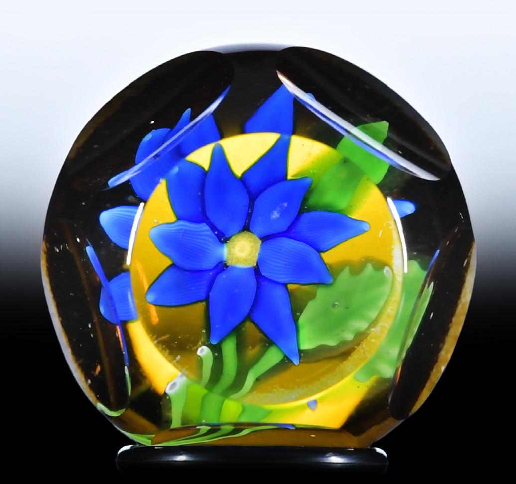 114 Antique Saint Louis blue clematis amber ground miniature faceted paperweight. A double-tiered cobalt blue clematis has a yellow match head center, a trailing green stem and two serrated green leaves. Transparent amber ground. Five and one facets. Fine condition.