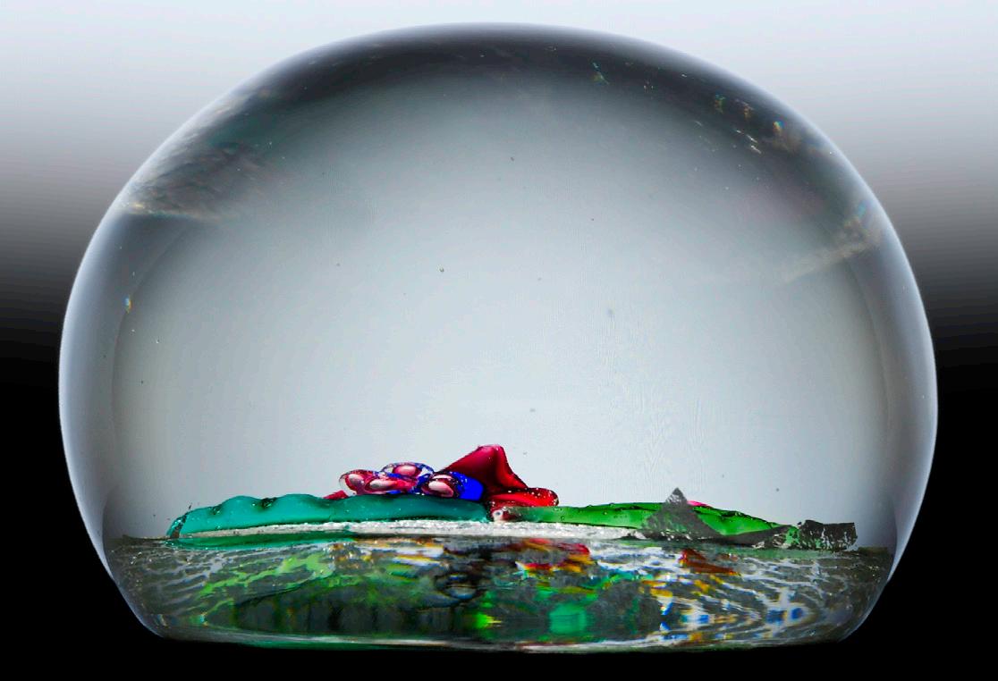 71 Antique Saint Louis two-colored crown miniature paperweight. Twisted ribbons of red and blue alternate with white latticinio ribbons and cascade into a cambered crown from a very large blue, white and yellow floret and cog complex cane at the apex. Hollow clear interior. “A Saint Louis specialty.” —The Encyclopedia of Glass Paperweights .