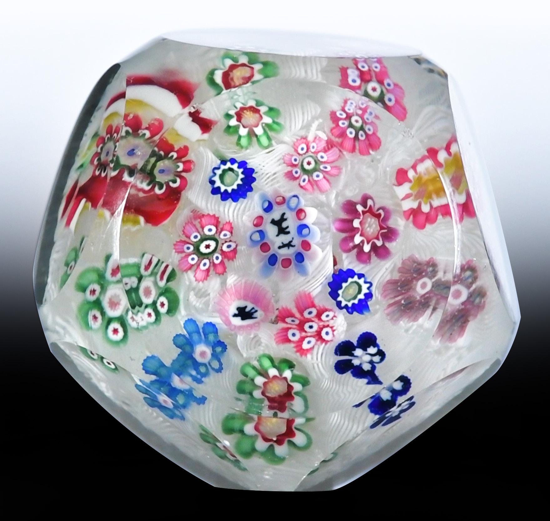 23 Excellent antique Clichy cinquefoil millefiori garland and roses faceted paperweight. An iconic pink and green rose cane appears tightly nestled in each empty lobe of a cinquefoil garland of blue cog canes, while a maroon cog spaces each lobe on the outside. Two close concentric rings of pastry mold in red and green hone in on a larger cobalt blue pastry mold cane, perfectly centered and nestled in the center of the garland. White upset muslin cushion over parallel latticinio rods. Five large side facets, perfectly aligned to reveal each of the rose canes, alternate with vertical flutes, below a top facet. Fine condition.