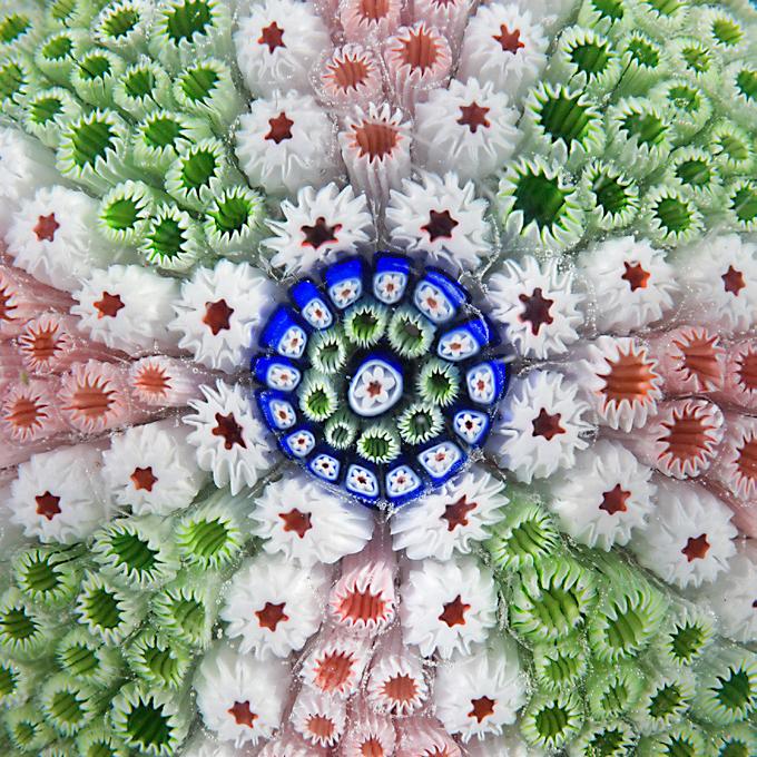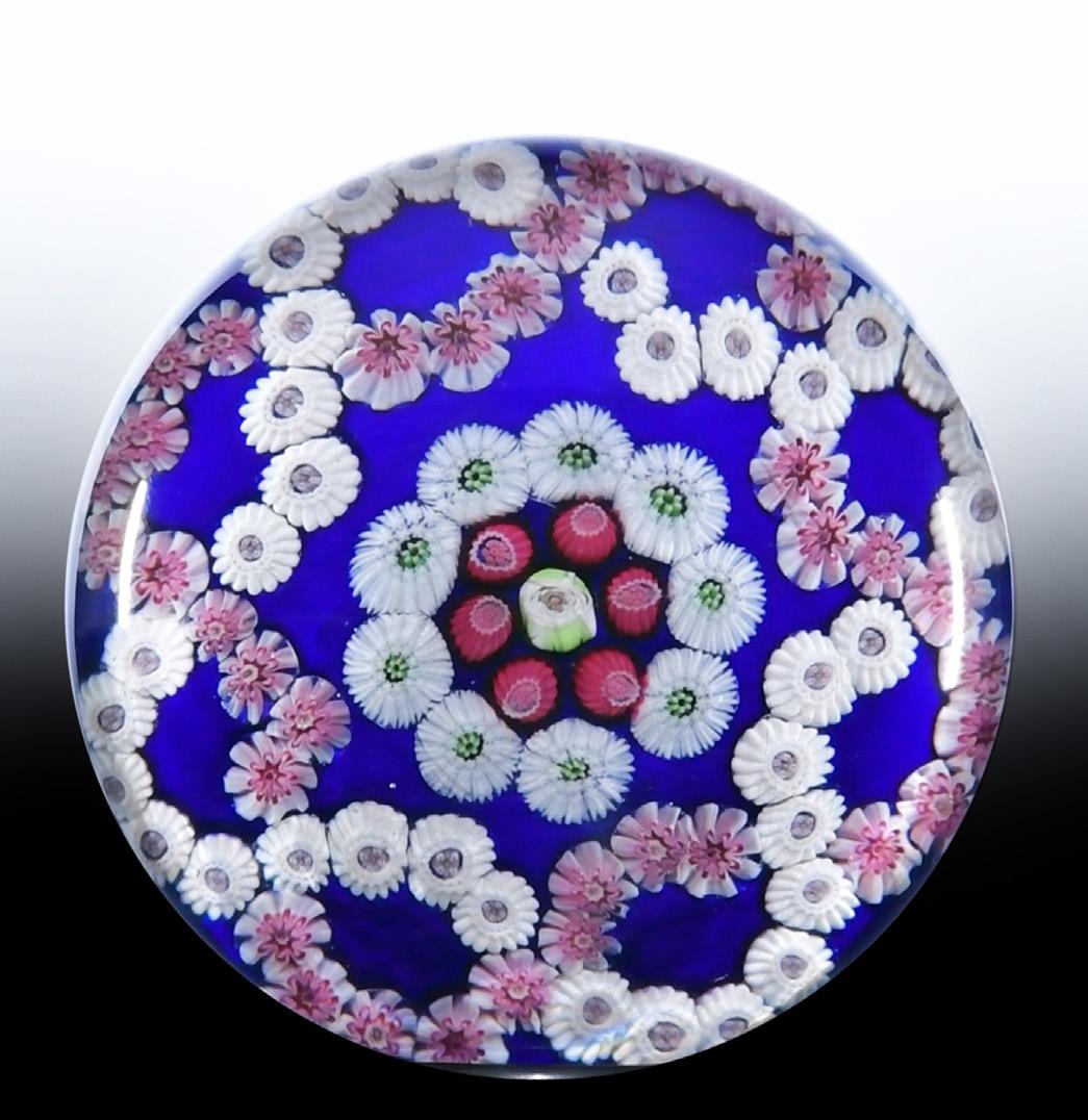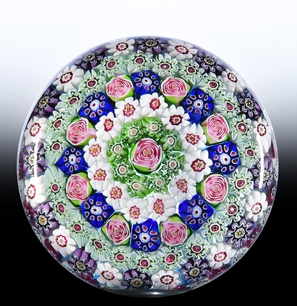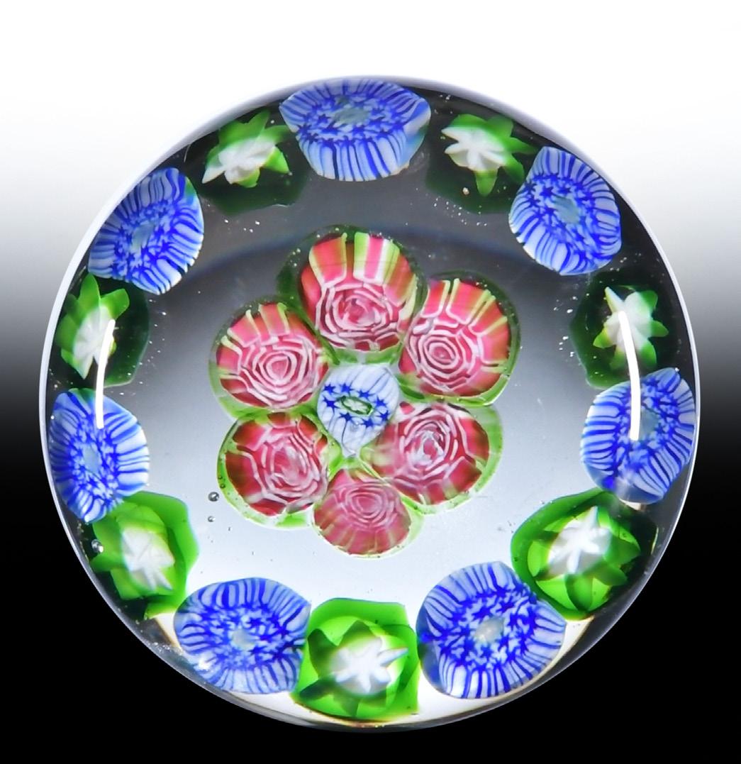 100 Antique Saint-Mandé concentric millefiori and roses paperweight. Six large pink, white and green rose canes form a ring around a white and blue star bundle cane, and are encircled by blue and white star bundle canes spaced by transparent green-collared white star canes. Clear ground.