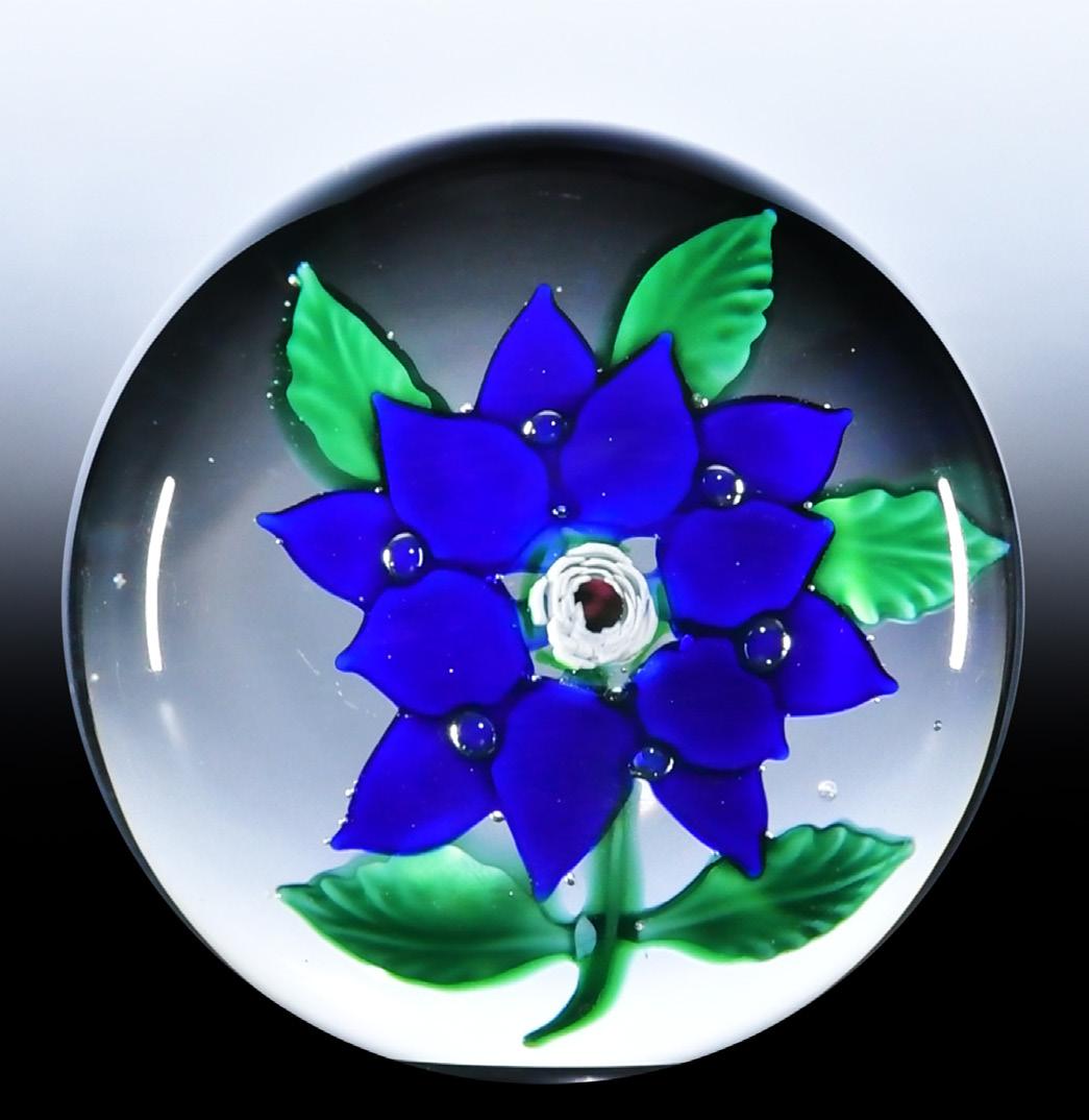 Antique Boston & Sandwich Glass Company blue poinsettia and Lutz rose paperweight. A fine white and green rose cane from Nicholas Lutz, with a translucent pink core, sits at the center of two tiers of six cobalt blue petals each to create a dew-dotted poinsettia blossom, crowned by three serrated leaves and sitting atop a stem flanked by two more leaves. Clear ground.