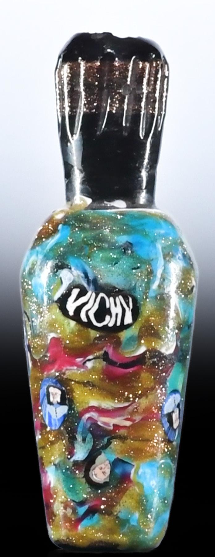 95 Antique Venetian “Vichy” and portrait canes scent bottle. A notable “Vichy” word cane joins the six portrait canes of Pope Pius IX, Garibaldi, Macini, Cavour and Victor Emanuel, amidst swirls of gold aventurine and colored glass, in green, blue, magenta and white. Black ridged top, accented with gold aventurine. Unknown Venetian manufacturer, mid-to-late 19th century. A similar example sold in the L.H. Selman Ltd. Spring 2003 30th Auction as lot 88. Diameter 1", height 2 7/8"