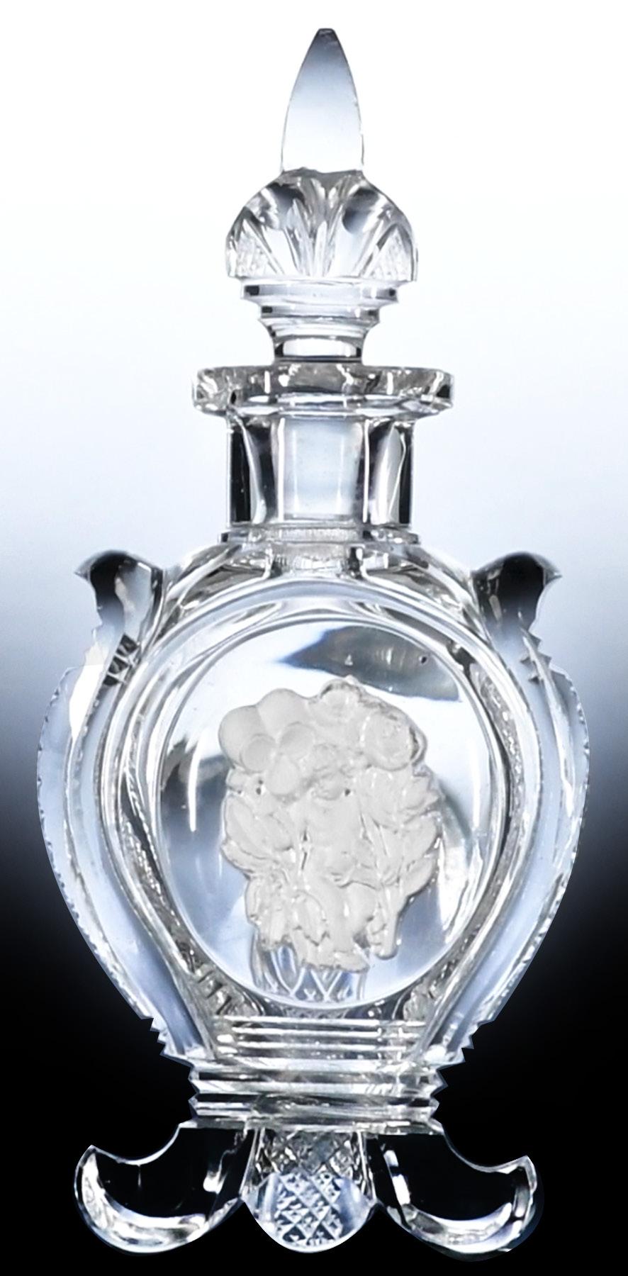 94 Rare antique Clichy rose, pansy and cherub sulphide fancy-cut scent bottle and stopper. A white sulphide of a chubby cherub nestled in a bouquet with a pansy stem and a rose stem, possibly representing sentiment between France and England, is pressed in a clear disc on the surface of a clear vessel, shaped in the “fleur de lys”. Diamond-cutting to the side, back and foot, below a similarly-cut stopper. Engraved “47” on the foot. Fine condition.