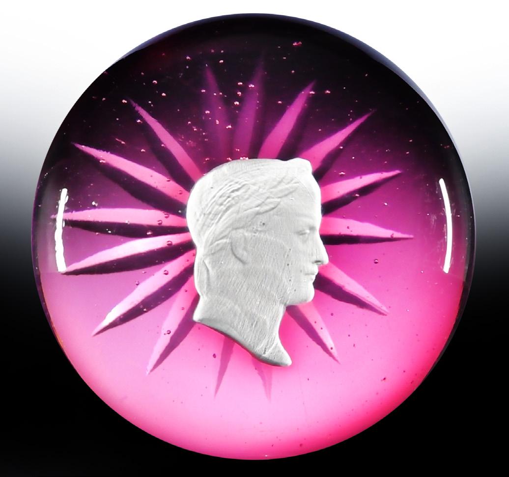 37 Unidentified, possibly 19th Century French, Napoleon Bonaparte sulphide paperweight. A shimmering white sulphide of Napoleon I, Emperor of the French, in profile with a laurel wreath, floats over a transparent ruby red star-cut ground. Good condition.