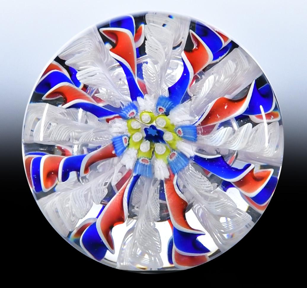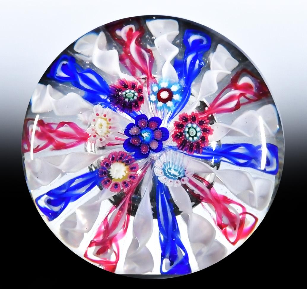 24 Rare antique Baccarat cinquefoil millefiori garland with Gridel canes paperweight. A central red, blue and white arrowhead cane is encircled by a ring of red and white star and bull’s-eye canes, which in turn is surrounded by a five-loop garland, each one a unique loop of complex canes, including cogs, stars, whorls, arrowheads, quatrefoils and trefoils, in white, red, green and blue. A single Gridel cane of a goat, a moth, a rooster, a dog and a pheasant punctuate each of the garland’s inner loops. Clear ground.