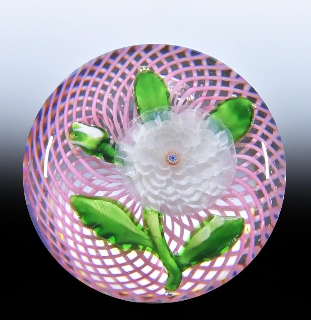 108 Antique Saint Louis pompon and bud miniature paperweight. A pretty white pompon, with diaphanous outer petals and a golden rod cane center, is framed by a companion bud and two spaced leaves, an additional two leaves flanking a slightly bending stem. Double-swirl pink latticinio cushion over clear ground. Good condition.