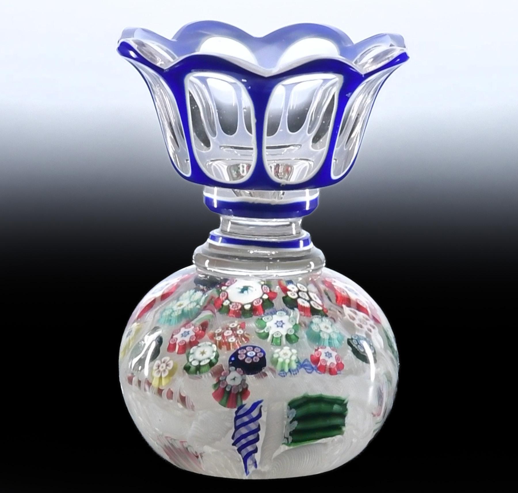 92 Rare antique Silesian/Bohemian Josephinenhutte scattered millefiori and silhouette overlay faceted vessel. A horse silhouette cane rests among other assorted complex canes, all of which are scattered on a cushion of white upset muslin with bits of colorful filigree, within a paperweight base for a cobalt blue-over-white double overlay flared vessel, with eight elongated round facets. Internal flaws.