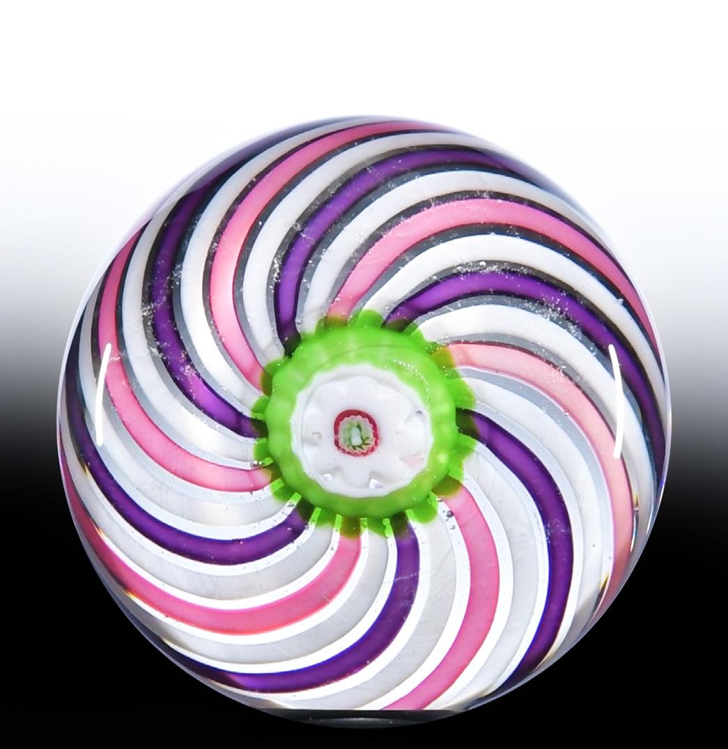 65 Rare antique Clichy pink, purple and white three-colored swirl paperweight. Moving inward in a counter-clockwise motion, ribbons of alternating white, purple and pink swirl toward a very large green-over-white crimp cane with a red, white and green-dotted white flower cog center. Clear ground. Excellent condition.