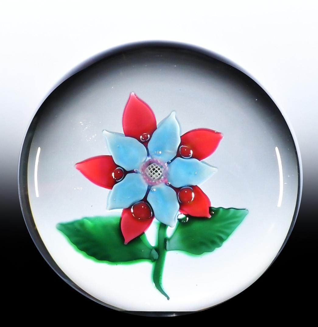 111 Antique Boston & Sandwich Company two-colored double poinsettia paperweight. Five light blue pointed petals radiate around a central white grid cane, encircled by tiny pink star canes, and are spaced by a second tier of red petals, each dotted with an air bubble dew drop, to form a stunning poinsettia bloom, supported by a tapered stem and two serrated green leaves. Clear ground.