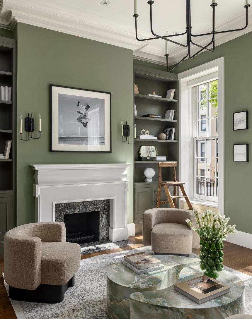 TThe light filled dining room features a wood-burning fireplace and direct access to the quarter-acre shared private garden, while the chef’s kitchen impresses with radiant-heated tile floors, stone countertops, walnut cabinetry, professional-grade appliances, custom sinks, built-ins, pantry, and a desk workspace. A tucked away marble-clad powder room completes this level.