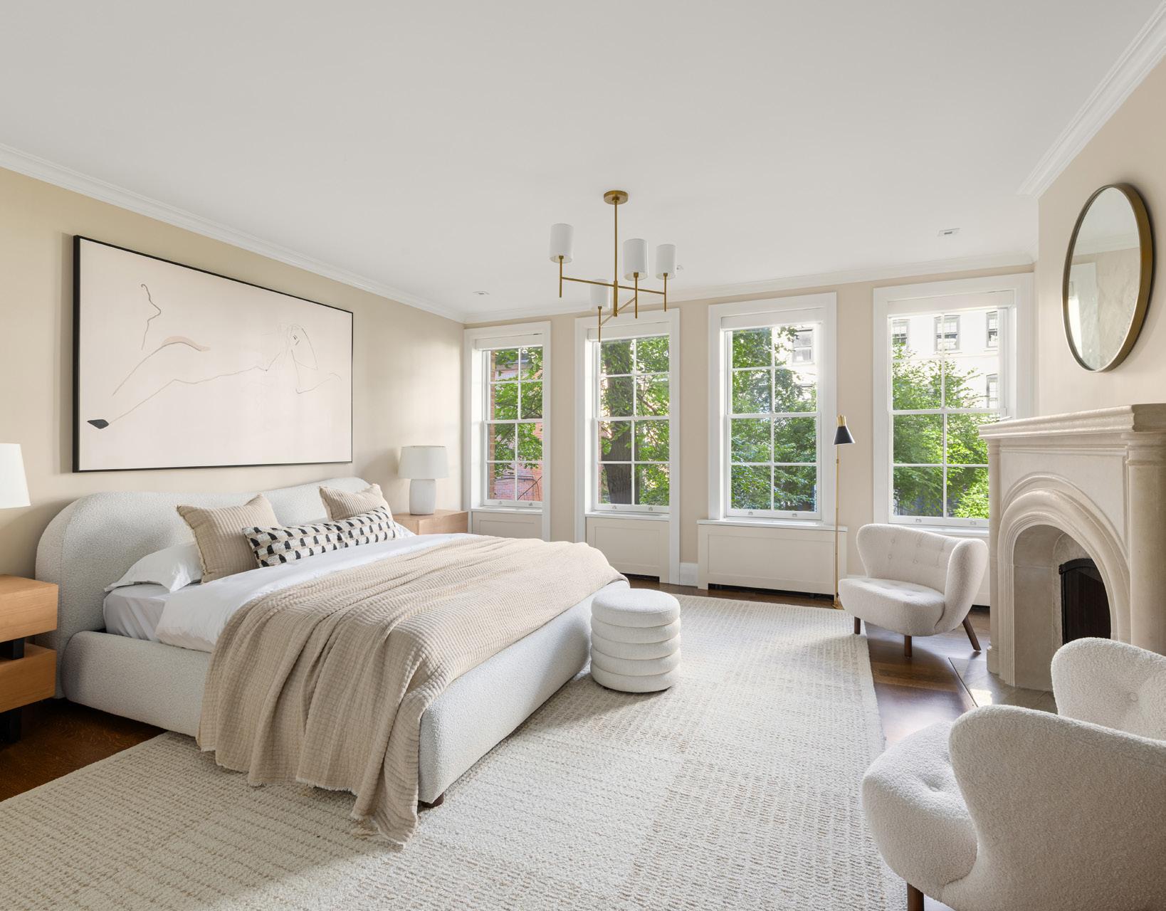 The primary suite, occupying the entire third floor, features four oversized windows framing serene garden views and two limestone wood-burning fireplaces. The marble-clad five-fixture bath boasts radiant-heated floors, dual vanities, a soaking tub with separate shower, and a handmade mosaictile floor. A corridor of custom closets provides abundant storage, while an additional front room offers flexible space for a sitting room, office, dressing room or additional bedroom.