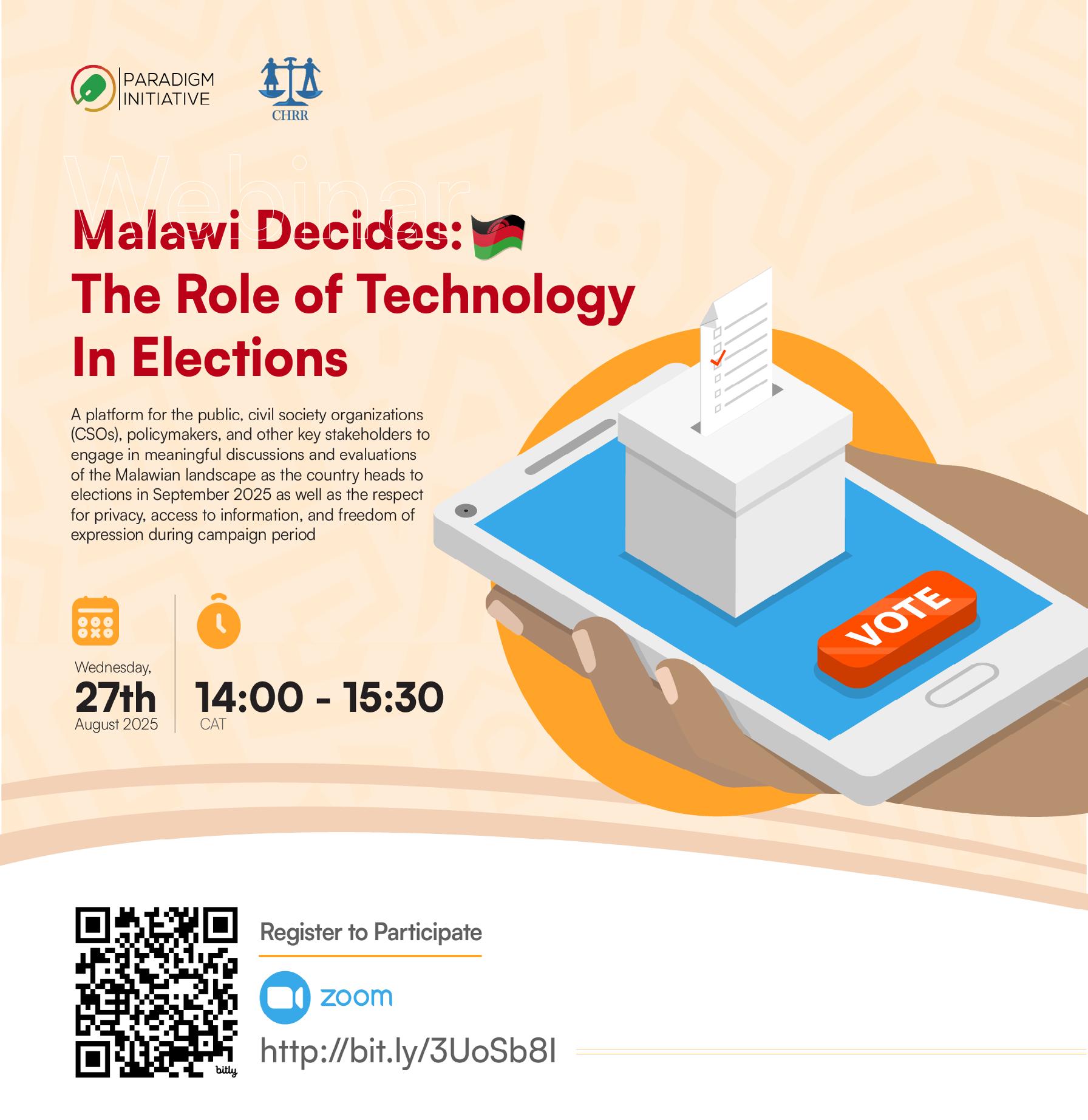 On August 27, Paradigm Initiative hosted a webinar to explore the intersection between democracy and technology in Malawi ahead of its upcoming elections. The webinar brought together citizens, Civil Society Organisations (CSOs), policymakers, and key stakeholders to explore how technology is shaping democracy, protecting privacy, enabling access to information, and defending freedom of expression in Malawi’s elections.