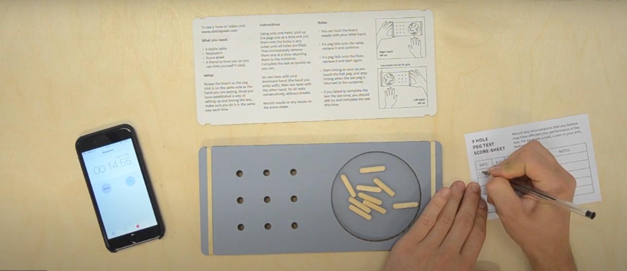 The 9-HPT is a brief, standardized, quantitative test of upper extremity function. It is the second component of the MSFC to be administered at each visit. Both the dominant and non-dominant hands are tested twice. The patient's dominant arm is tested first. Instruct the patient to: o “Pick up the pegs one at a time, using your right (or left) hand only and put them into the holes in any order until the holes are all filled.
