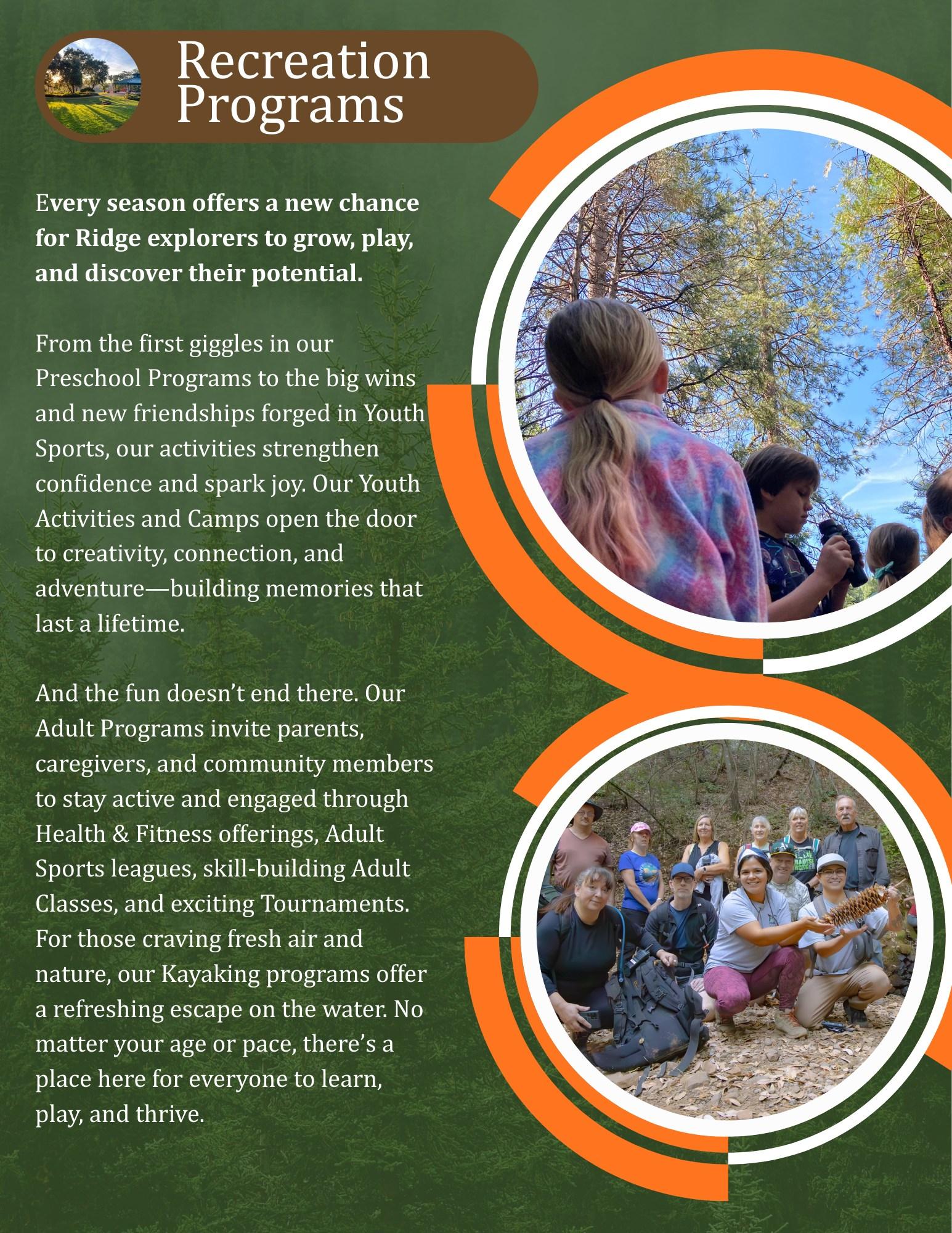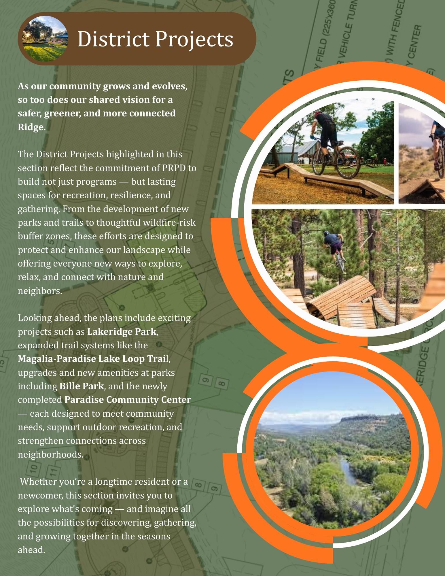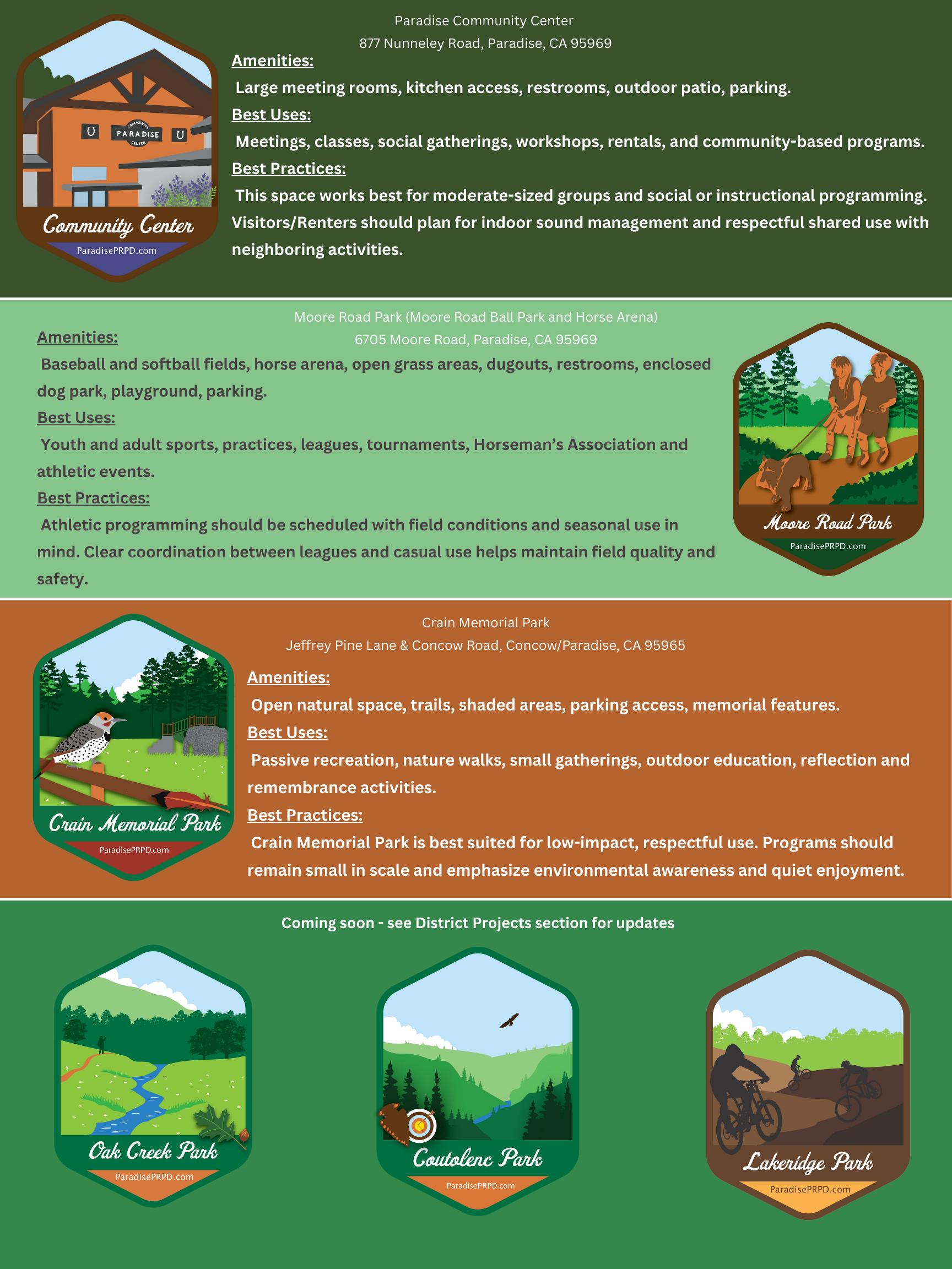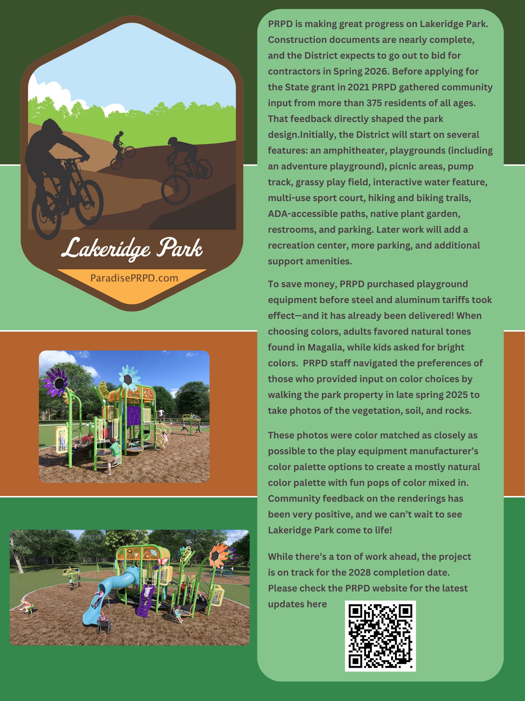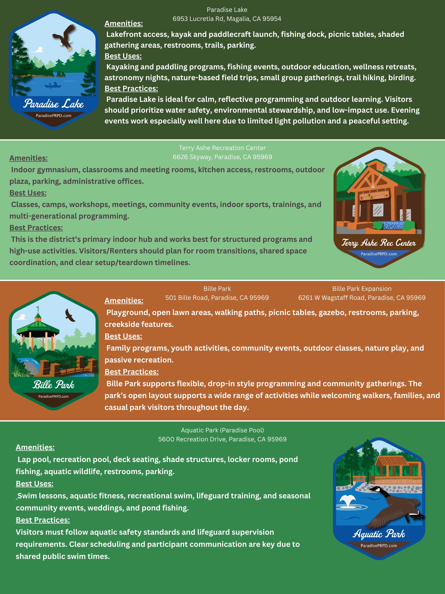 We are also hopeful to complete in time for pool season the new aquatic recreation center at the Paradise Pool, and we just got the keys and our team planning events and classes at the Paradise Community Center. If all goes well, we should begin accepting rentals in summer 2026. Behind the scenes, a long season of planning will transform new facilities, with work starting this summer at Lakeridge, Bille Park, and a new play structure at Moore Road. Please check in with us as progress continues and plans come more into focus.