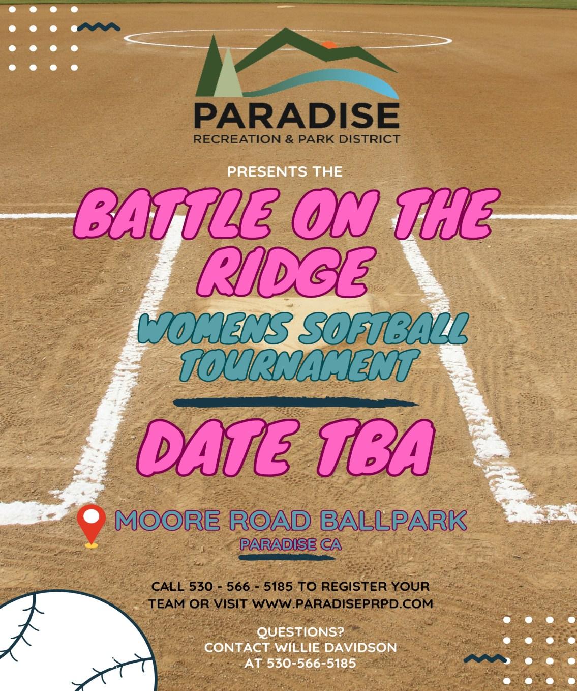 Time to bring tournament softball back to the Ridge. This ongoing Paradise tradition had been going 16 years prior to the Camp Fire and it’s time to bring it back to the Ridge. This will be the second of three softball tournaments scheduled. This will be the Battle of the woman’s weekend. Structure of this tournament to be determined by instructor by tournament date.