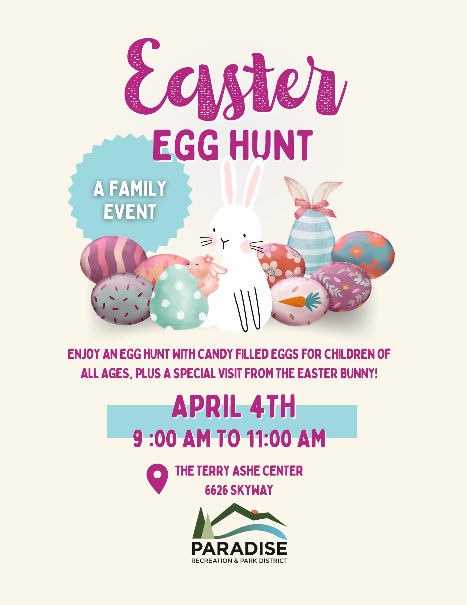 Calling all children in preschool through sixth grade to hop on over to the Terry Ashe Recreation Center Park to join in on some Easter fun. Children can hunt for eggs and then meet the Easter Bunny and receive a special treat. 4-H will also be at the event showing some of their animals.