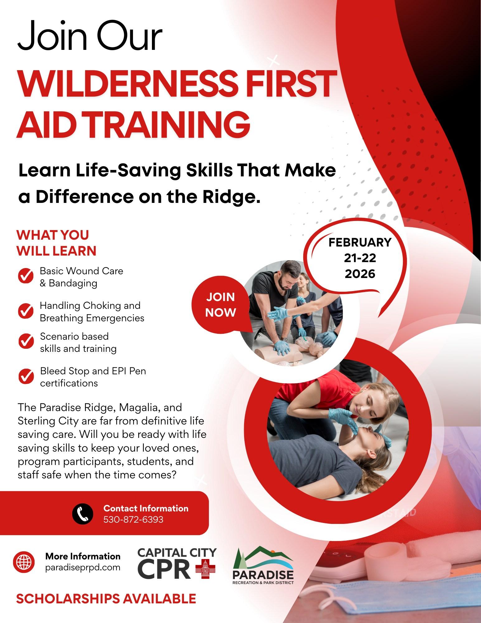 This two-day Wilderness First Aid course covers the assessment and treatment of injuries, illnesses, and environmental hazards encountered in outdoor settings. Training includes OSHA-approved First Aid, CPR, and AED certification.