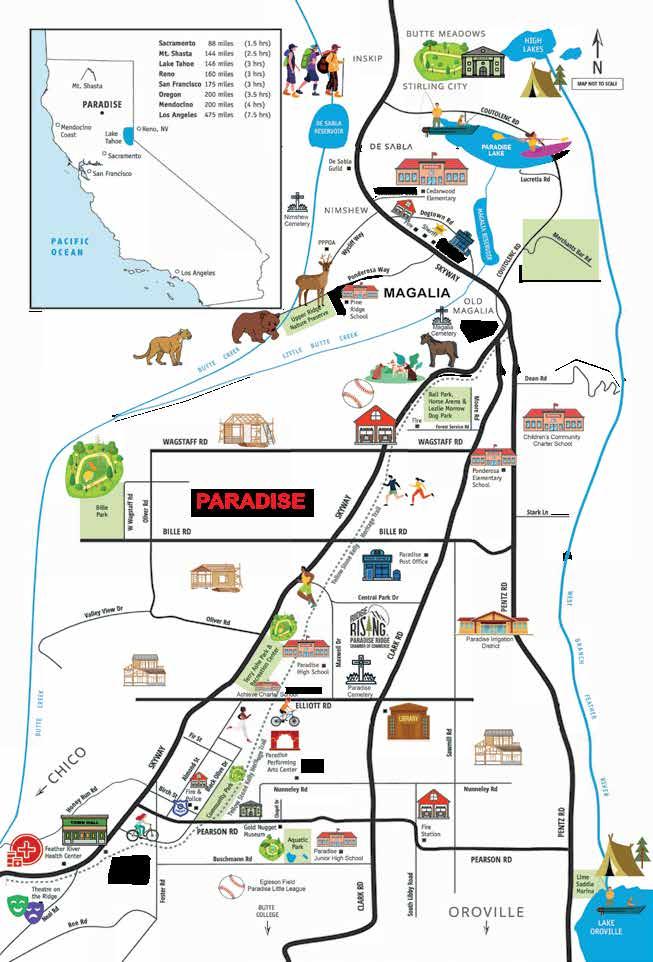 The ruts of the Overland Stage route through Paradise were paved long ago, but visitors will continue to visit this unique locale, finding delight in its beauty and a warm welcome in its people. On November 8, 2018, Paradise, Magalia and neighbors were devastated by the most destructive wildfire in California history. As we evolve and rebuild, we invite you to explore our remarkable community of indomitable pioneers.