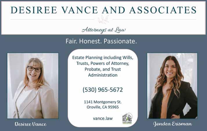 2112 Fifth Ave., Oroville 530-877-6332 Proudly serving Butte County for over 25 years Christian Atherton ATTORNEY AT LAW Who will decide what happens with your assets when you can’t? BE PREPARED Wills Trusts & Trust Administration Probate Estate Planning