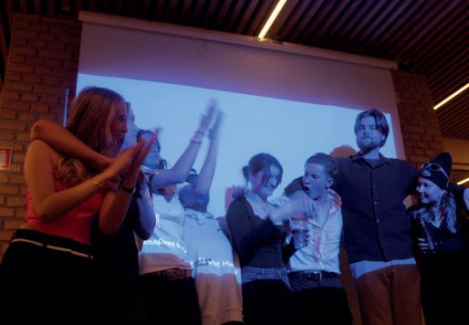 filmaften og den årlige sommerhustur - vi afholder også en screeningsaften, hvor vi bestiller mad og ser årets revy sammen for første gang som publikum. Vi har også en midtvejsfest, hvor vi får afsløret hvem der har fået hvilke roller og hvordan det endelige manuskript ser ud. Sidste år var temaet for midtvejsfesten Barbie.