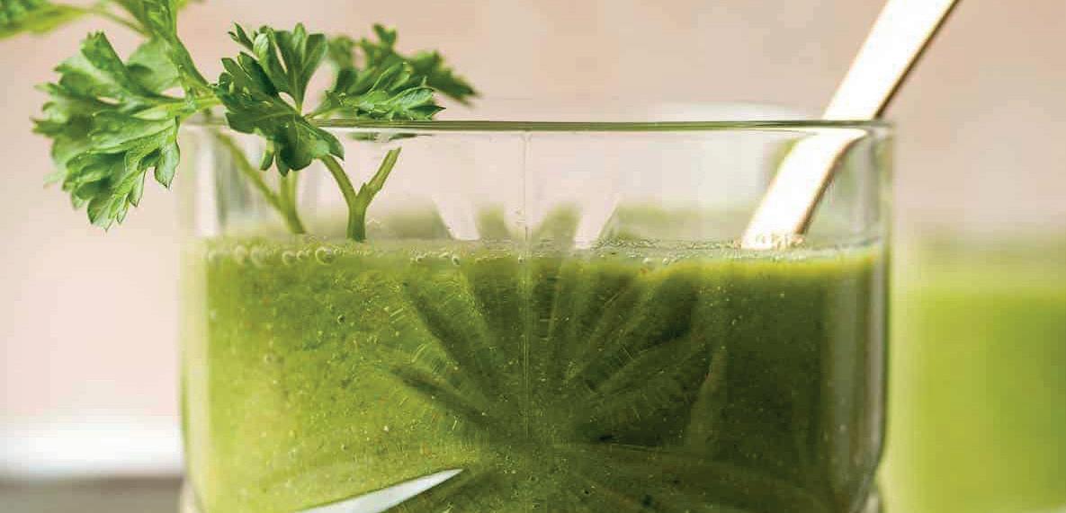 2. Hæld grøntsagerne i blenderen sammen med urteteen og blend indtil det får karakter af en meget finkornet, grøn og velduftende grød.