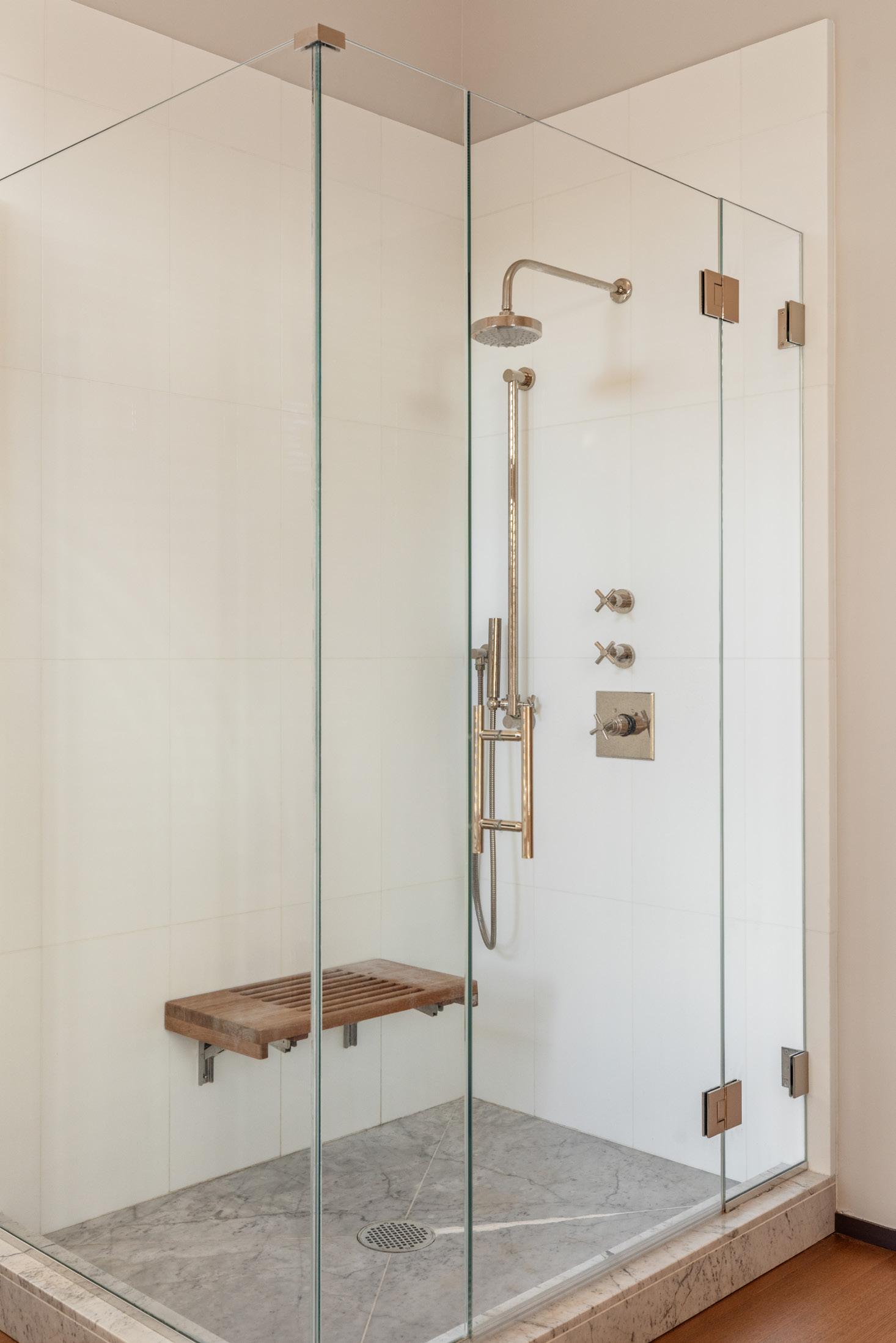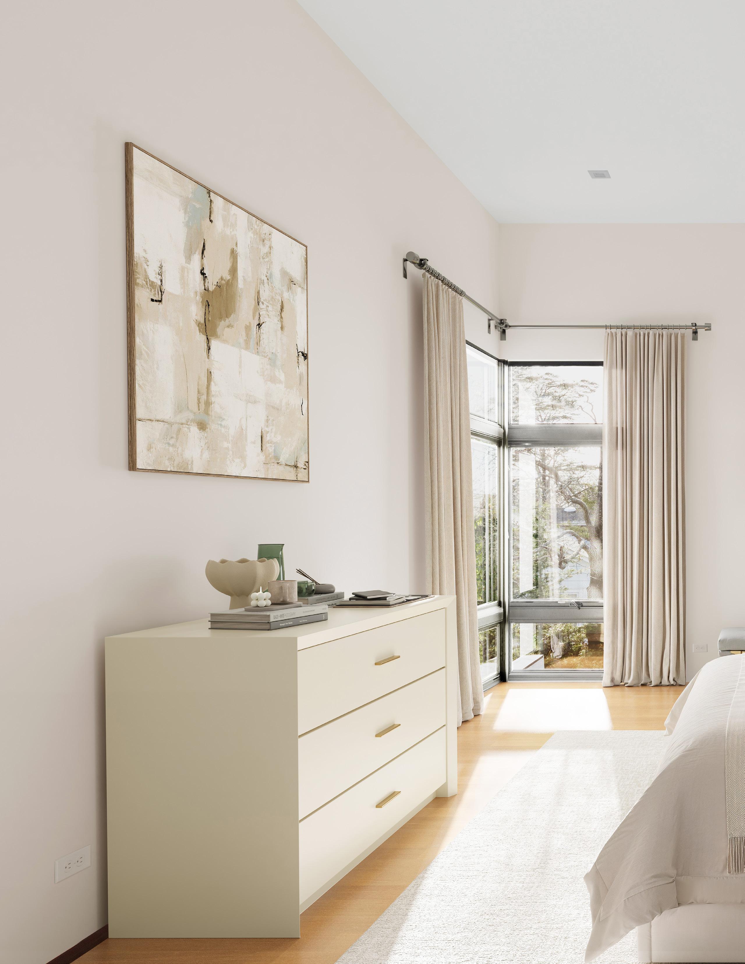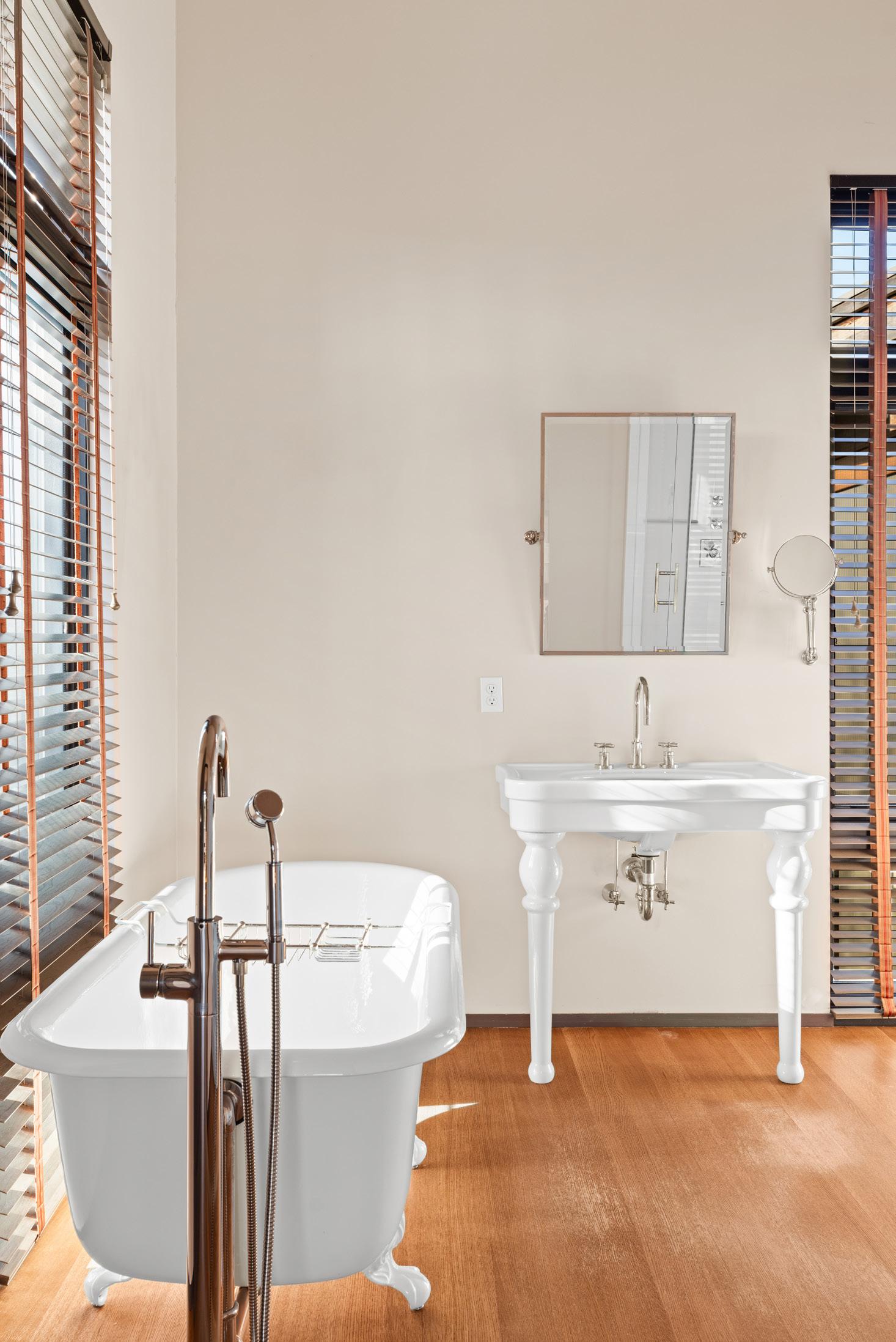 Privately tucked on this same level, the primary suite is a refined sanctuary. A large walk-in closet, spa-inspired bathroom with a soaking tub, and large-format tilework elevate the everyday.