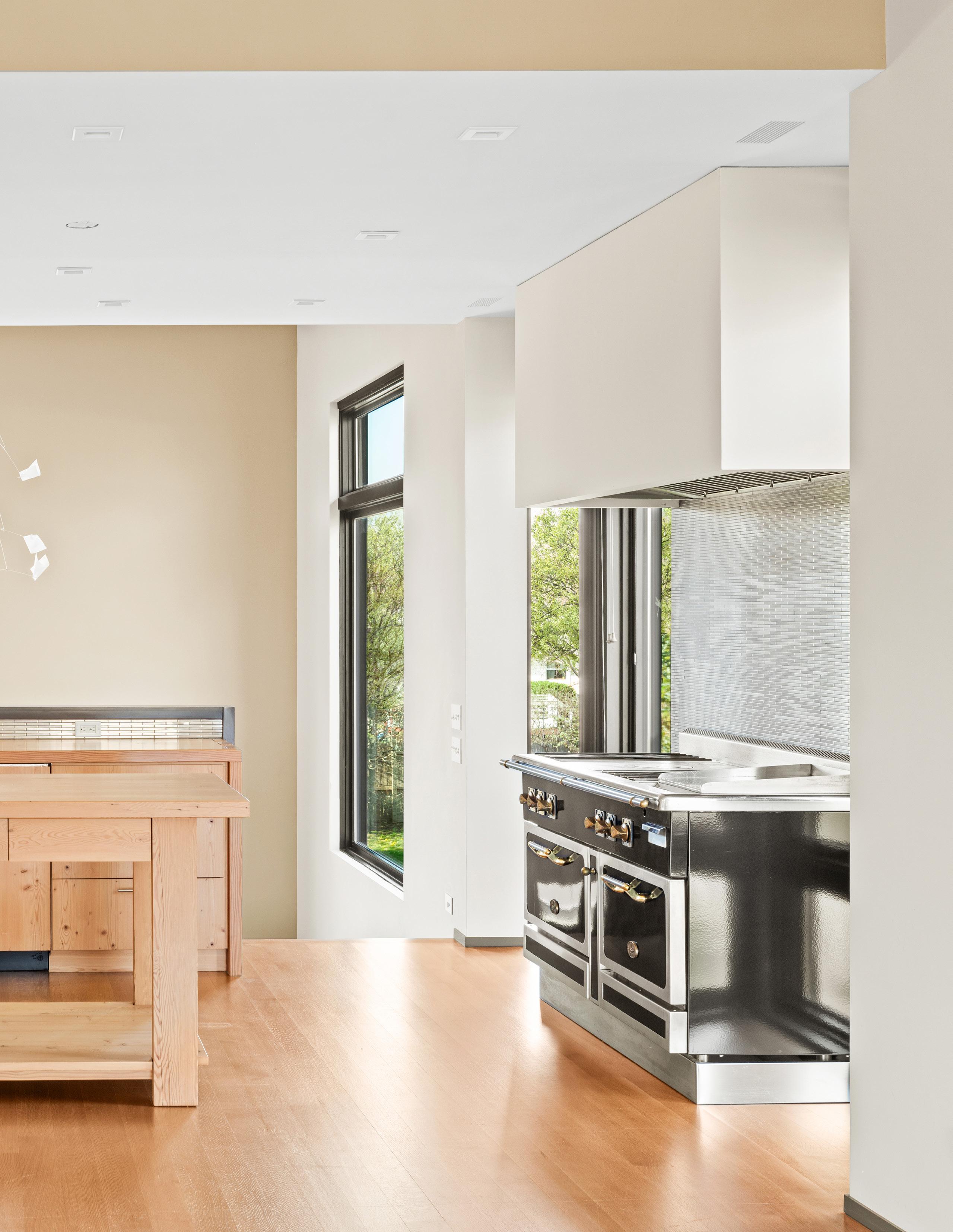 Doug Fir cabinetry and wood countertops define the chef’s kitchen, paired with Sub-Zero appliances and a Diva induction range.