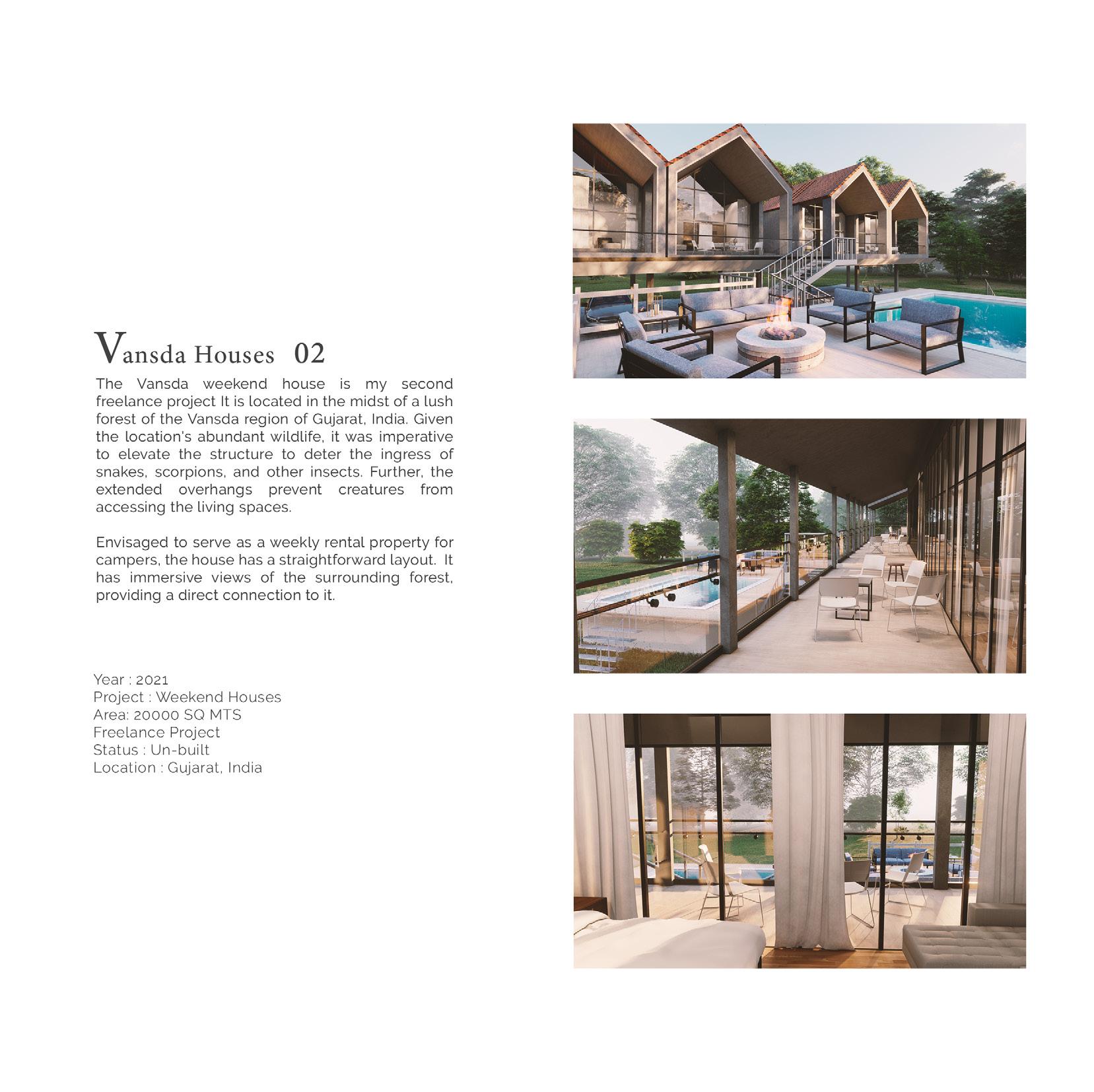 The Vansda weekend house is my second freelance project It is located in the midst of a lush forest of the Vansda region of Gujarat, India. Given the location’s abundant wildlife, it was imperative to elevate the structure to deter the ingress of snakes, scorpions, and other insects. Further, the extended overhangs prevent creatures from accessing the living spaces.