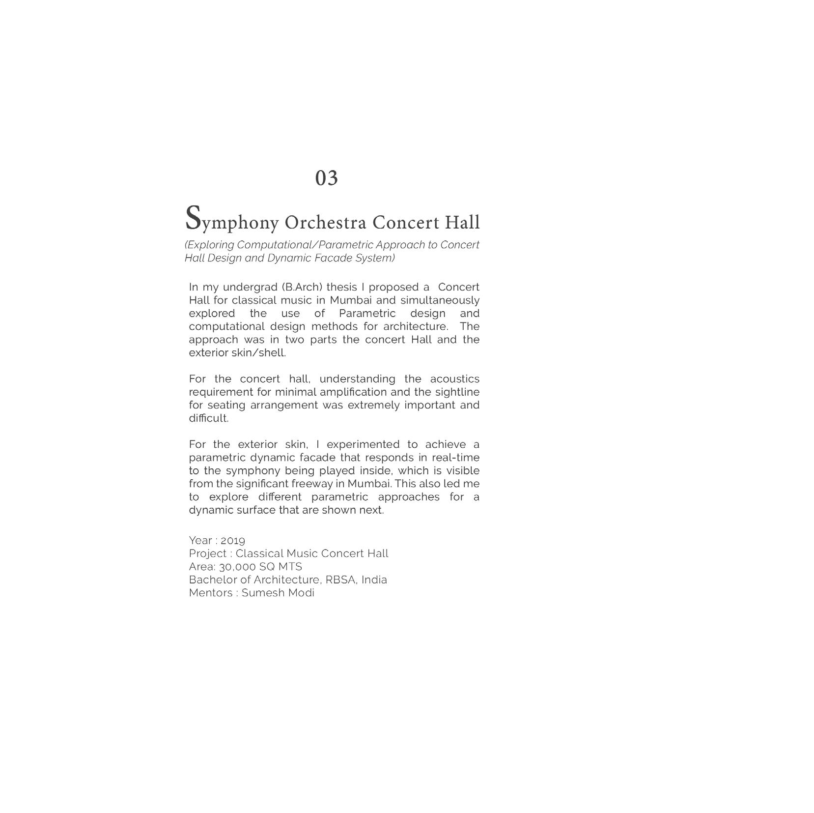 In my undergrad (B.Arch) thesis I proposed a Concert Hall for classical music in Mumbai and simultaneously explored the use of Parametric design and computational design methods for architecture. For the concert hall, understanding the acoustics requirement for minimal amplification and the sightline for seating arrangement was extremely important.