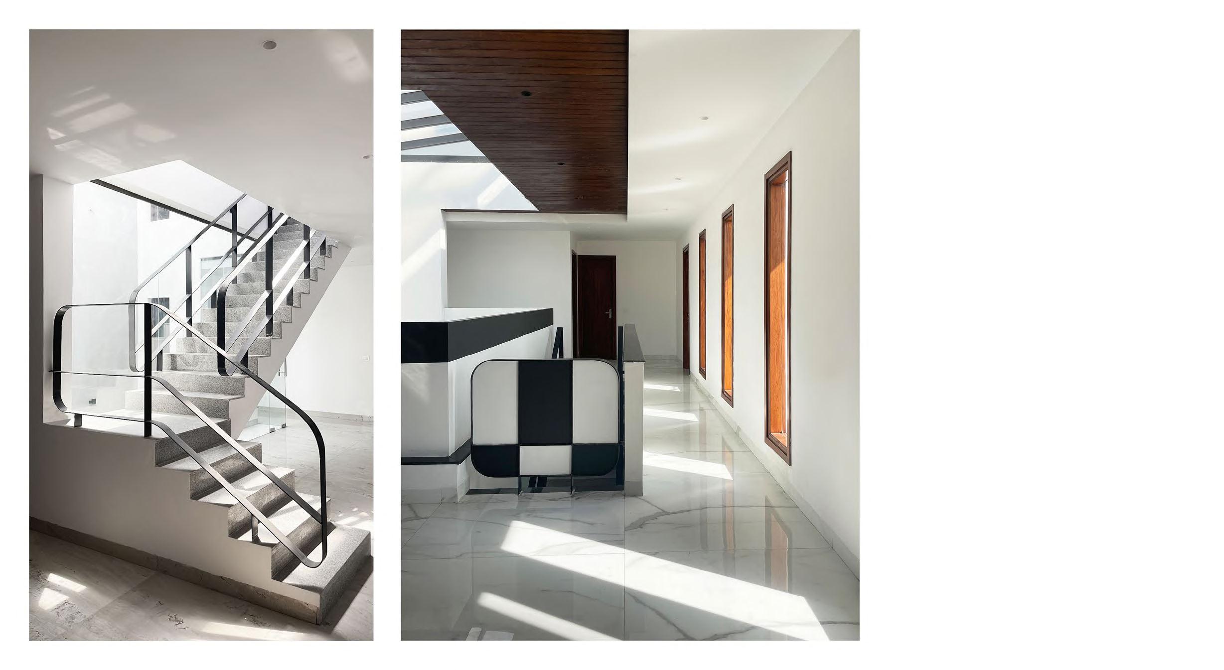 Second, is the double height space which connects the ground and first floor. A muralonthedoubleheightwallbecomesthe focal point of the house. It has been designed as an abstract composition resonating with the overall design of the house.