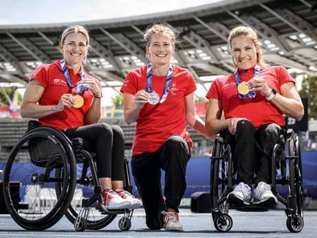 Lors des Championnats du monde d’athlétisme qui se sont déroulés en juillet à Paris, la délégation suisse de dix personnes, menée par Catherine Debrunner (à droite), Manuela Schär (à gauche) et Marcel Hug a montré des performances remarquables. Pas moins de quatorze médailles (huit d’or, six d’argent) ont couronné la participation aux CM de l’équipe helvétique. La relève n’était pas en reste : en saut en longueur, Elena Kratter (au centre) a remporté l’argent pour sa première participation à des CM. Ces résultats garantissent six places à la Suisse aux Jeux paralympiques 2024, qui auront aussi lieu à Paris.