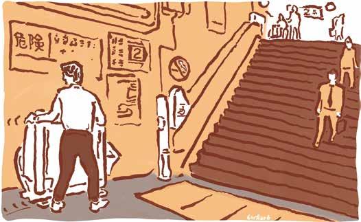 Unser Zug hält in einer Station in der Nähe des SensojiTempels in Tokyo. Der Ausgang ist zwei Stockwerke tiefer. Zielstrebig geht die Menschenmenge die Treppen hinunter, während mein Bruder und ich im Rollstuhl etwas verloren auf dem Perron zurückbleiben – der Lift ist defekt. Nach einer Weile kommt ein Bahnangestellter und montiert einen tragbaren Treppenlift am Geländer. Mit einer Fernbedienung begleitet er meine Fahrt. Im redaktion@paraplegie.ch