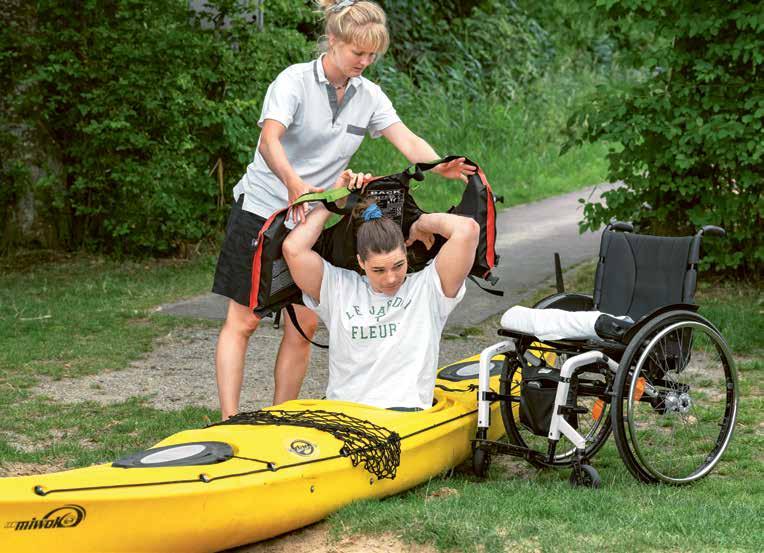Vorbereitung für den ersten Kajakausflug: Sporttherapeutin Amélie Fetzer mit Patientin