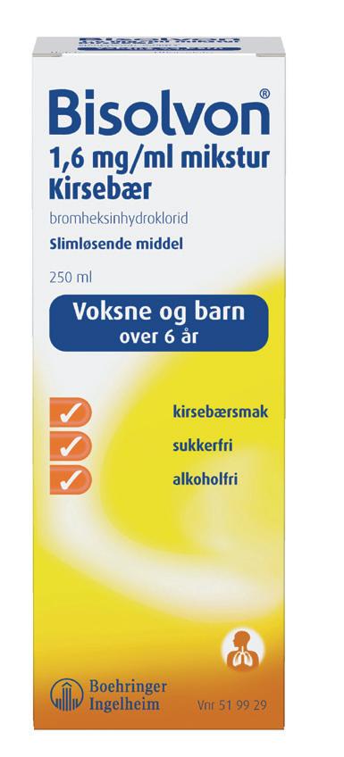 Bisolvon tynner, løser opp og fjerner slimet. Respirasjonsarbeidet lettes og hosten forårsaket av slimet reduseres.