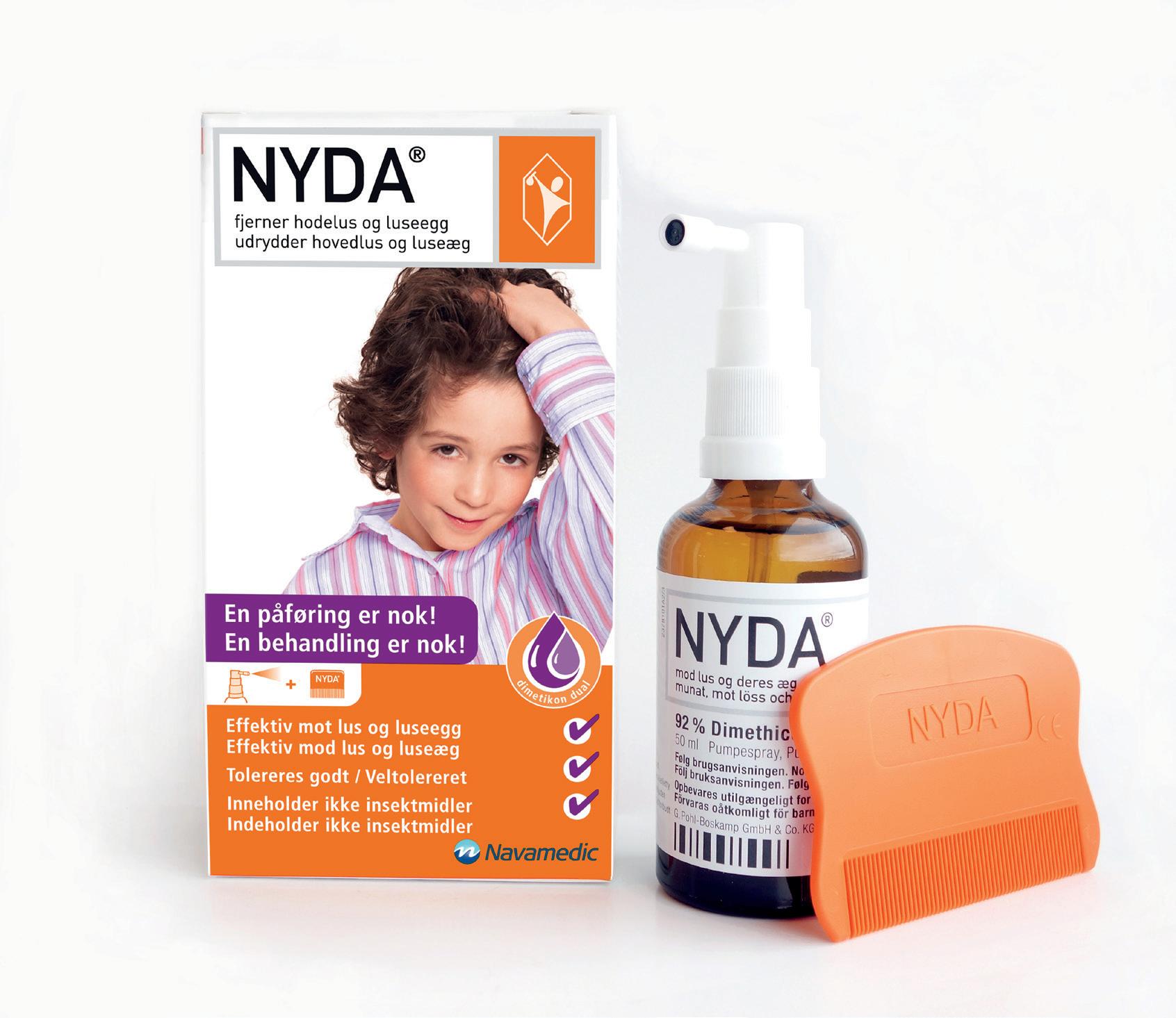 NYDA® er et nytt og effektivt middel mot hodelus som også dreper luseegg. Nyda® inneholder en blanding av to dimetikoner, som effektivt trenger inn i lusens pusteåpninger og på den måten kveler lusen. Også luseegg har pusteåpninger, for nymfene som utvikles inne i egget, må ha oksygen for å leve. Nyda trenger inn i disse åpningene og kveler på den måten de uklekkede lusene.