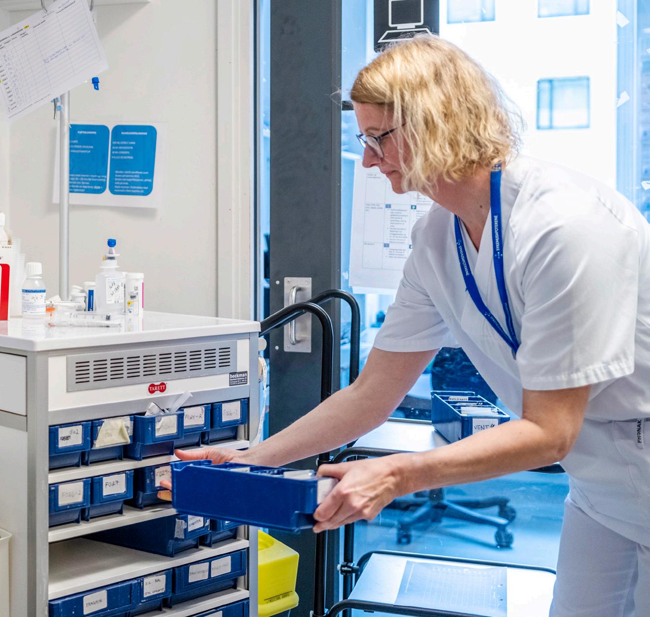 KLARGJØR MEDISINER TIL 200 PASIENTER Apotekteknikerne ved Sykehusapoteket Østfold klargjør faste medisiner ved til sammen 18 sengetun på sykehuset. side 12