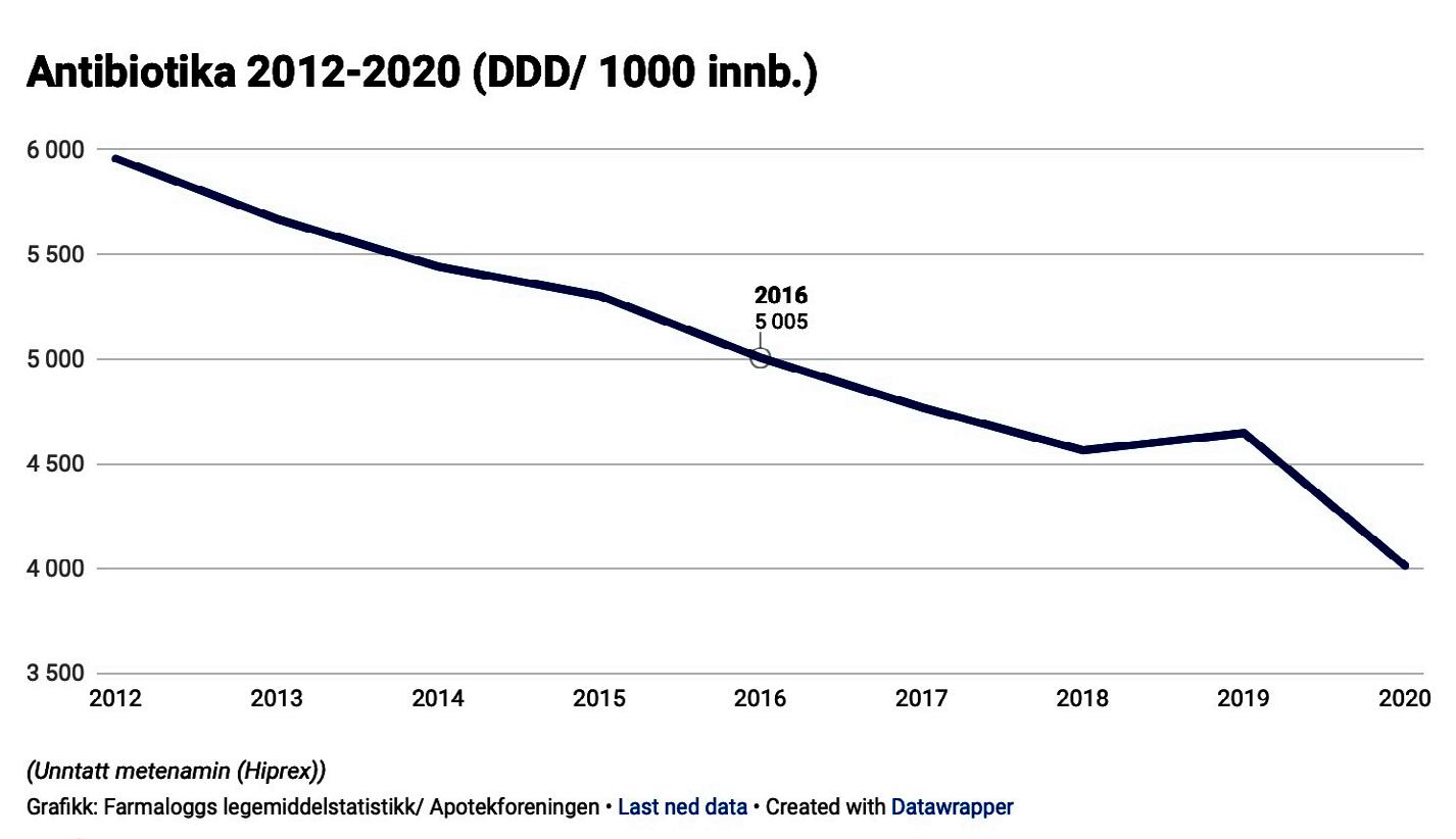 Pandemien bidro til måloppnåelse Flere gir koronapandemien noe av æren for at målet er nådd. Apotekforeningen gikk allerede i februar ut med tall som viste nedgangen i salg av antibiotika fra apotek. Fagdirektør Hanne Andresen kommenterte da at «uten de strenge smitteverntiltakene vi opplevde i fjor, er det ikke sikkert vi hadde kommet helt i mål».