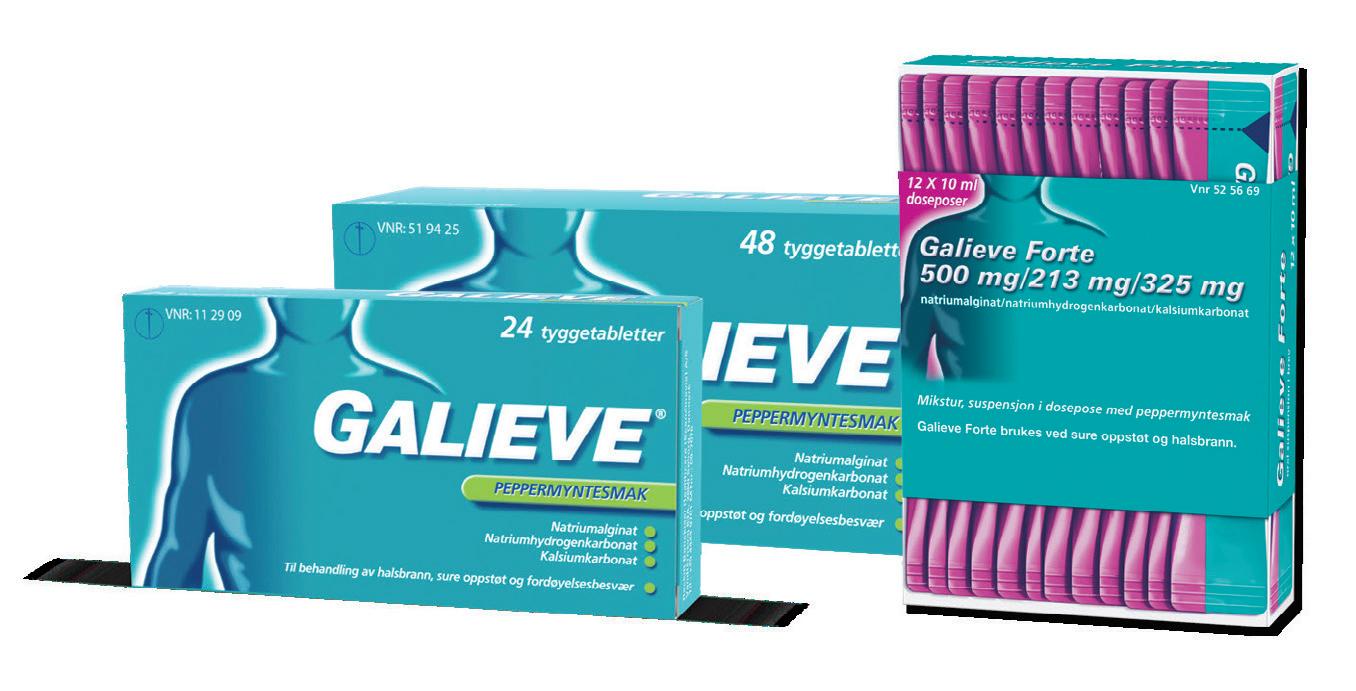 Referanser: 1. Galieve tuggetabletter, Preparatomtale, 27.11.2020, pkt 4.1, 5.1; 2. Galieve Forte Preparatomtale, 11.05.2020, pkt 4.1, 5.1; Galieve Forte mixtur suspension i dosepose. Galieve tyggetabletter. Antirefluksmiddel og antacidum. Galieve Forte: 1 dosepose (10 ml) inneh.: Natriumalginat 500 mg, natriumhydrogenkarbonat 213 mg, kalsiumkarbonat 325 mg, metyl- og propylparahydroksybenzoat (E 218 og E 216), karbomerer 974P, sakkarinnatrium, natriumhydroksid, renset vann. Peppermyntesmak. Galieve tyggetabletter: Hver tyggetablett inneh.: Natriumalginat 250 mg, natriumhydrogenkarbonat 133,5 mg, kalsiumkarbonat 80 mg, aspartam (E 951) 3,75 mg, mannitol (E 421), acesulfamkalium (E 950), hjelpestoffer. Peppermyntesmak. Indikasjoner: Galieve Forte: Behandling av syrerelaterte symptomer på gastroøsofageal reflukssykdom, som sure oppstøt, halsbrann og fordøyelsesproblemer, f.eks. etter måltid eller under graviditet. Tyggetabletter: Behandling av symptomer på gastroøsofageal refluks, som sure oppstøt, halsbrann og fordøyelsesbesvær, f.eks. etter måltid eller under graviditet eller pasienter med symptomer relatert til refluksøsofagitt. Dosering: Galieve Forte: Voksne og barn ≥12 år: 10–20 ml (1–2 doseposer) etter måltider og ved leggetid, opptil 4 ganger daglig. Tyggetabletter: Voksne og barn ≥12 år: 2-4 tabletter etter måltid og ved sengetid (inntil 4 ganger daglig. Spesielle pasientgrupper: Nedsatt nyrefunksjon: Forsiktighet utvises hvis streng saltfattig diett er nødvendig. Barn <12 år: Skal kun gis etter anvisning fra lege. Galieve Forte: Ingen dosejustering nødvendig. Administrering: Tyggetabletter: Tygges godt før svelging. Kontraindikasjoner: Overfølsomhet for innholdsstoffene. Forsiktighetsregler: Hvis symptomene ikke bedres innen 7 dager, bør klinisk status revurderes. Galieve Forte: Langvarig bruk bør unngås. Bruk kan skjule symptomer på mer alvorlige underliggende tilstander. Skal ikke brukes ved alvorlig nedsatt nyrefunksjon eller ved hypofosfatemi. Effekten kan være redusert ved svært lavt magesyrenivå. Økt risiko for hypernatremi hos barn med gastroenteritt eller mistenkt nedsatt nyrefunksjon. Tyggetabletter: Hjelpestoffer: Hver dose på 4 tabletter inneholder 253 mg (11 mmol) natrium, og bør vurderes ved kontrollert natriumdiett, f.eks. ved enkelte tilfeller av kongestiv hjertesvikt og nedsatt nyrefunksjon. Hver dose på 4 tabletter inneholder 320 mg (3,2 mmol) kalsiumkarbonat, og forsiktighet må utvises ved hyperkalsemi, nefrokalsinose og tilbakevendende kalsiumholdig nyresten. Galieve Forte: Hjelpestoffer: Inneholder 127,88 mg natrium per 10 ml (1 dosepose). Dette tilsvarer 6,39 % av WHOs anbefalte maksimale daglige inntak av natrium. Maksimal daglig dose for dette legemidlet tilsvarer 51,15% av WHOs anbefalte maksimale daglige inntak av natrium. Anses som natriumrik. Dette må det spesielt tas hensyn til i tilfeller der en saltfattig diett er anbefalt, f.eks. ved enkelte tilfeller av kongestiv hjertesvikt og nedsatt nyrefunksjon. Hver 10 ml (dosepose) inneholder 130 mg (3,25 mmol) kalsium. Forsiktighet bør utvises ved behandling av pasienter med hyperkalsemi, nefrokalsinose og tilbakevendende kalsiumholdige nyresteiner. Inneholder metyl- og propylparahydroksybenzoat som kan gi allergiske reaksjoner (mulig forsinkede). Tyggetabletter: Inneholder 3,75 mg aspartam i hver tablett og skal ikke gis ved fenylketonuri. Pasienter med sjeldne arvelige problemer med fruktoseintoleranse, glukose-galaktose malabsorpsjon eller sukrase-isomaltase-insuffisiens, bør ikke ta dette legemidlet. Interaksjoner: For utfyllende informasjon fra Legemiddelverket om relevante interaksjoner, se A02BX13. Bør tas minst 2 timer før/etter andre legemidler, særlig H2-antihistaminer, tetrasykliner, digoksin, fluorokinoloner, jernsalter, ketokonazol, nevroleptika, thyreoideahormoner, penicillamin, betablokkere (atenolol, metoprolol, propranolol), glukokortikoider, klorokin, estramustin og bisfosfonater. Graviditet, amming og fertilitet: Galieve Forte: Ingen skadelige effekter er vist. Kan brukes ved graviditet og amming, hvis nødvendig. Pga. innhold av kalsiumkarbonat anbefales det at behandlingsvarigheten begrenses. Fertilitet: Ingen negativ effekt er vist. Tyggetabletter: Ingen skadelig effekt er vist. Kan brukes under graviditet og amming. Bivirkninger: Svært sjeldne (<1/10 000), ukjent: Immunsystemet: Anafylaktiske/anafylaktoide reaksjoner, overfølsomhetsreaksjoner som urticaria. Luftveier: Effekter på respirasjonssystemet som bronkospasme. Galieve Forte: Gastrointestinale: Abdominalsmerte, diaré, kvalme, oppkast, sure oppstøt. Hud: Kløende utslett. Overdosering/Forgiftning: Symptomer: Abdominal distensjon kan forekomme. Behandling: Symptomatisk. Se Giftinformasjonens anbefalinger: A02BX13. Egenskaper: Galieve Forte: Virkningsmekanisme: Reagerer raskt med magesyren og danner en beskyttende barriere av alginsyregel med tilnærmet nøytral pH. Sjiktet legger seg oppå mageinnholdet og hindrer gastroøsofageal refluks i opptil 4 timer. I alvorlige