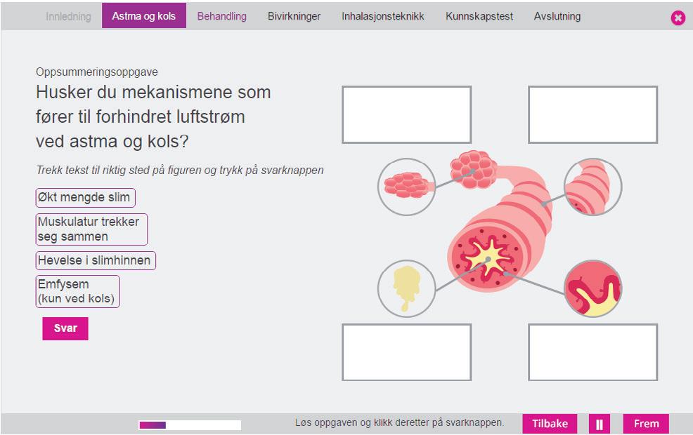 I kurset lærer du om likheter og forskjeller på astma og kols. Gjennom to kundesituasjoner vil du lære om behandlingsprinsipper, hvordan de ulike legemidlene virker og hvilke bivirkninger de kan gi.