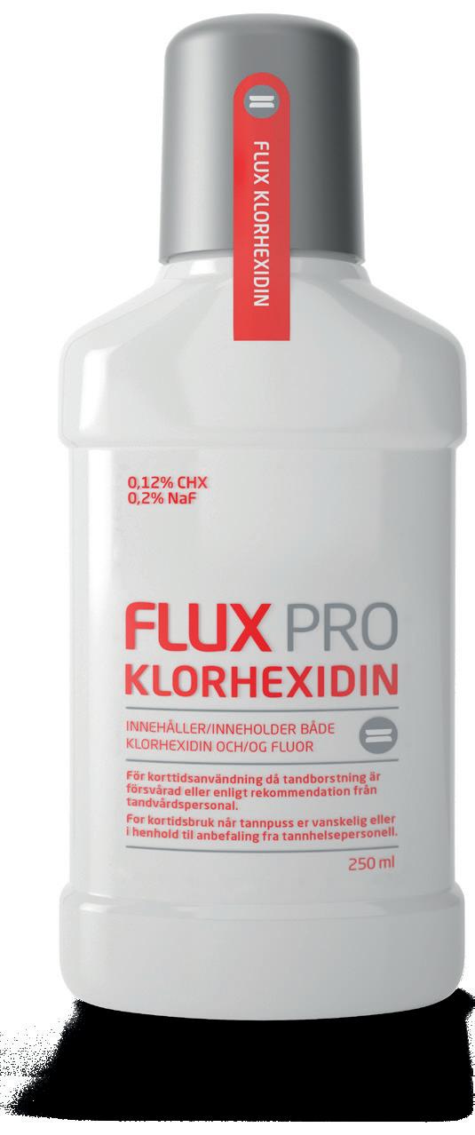 Flux PRO Klorhexidin inneholder både klorheksidin og fluor. Produktene er for kortidsbehandling eller etter anbefaling fra tannhelsepersonell. Som øvrige Flux produkter er de uten alkolhol og parabener. Utviklet i samarbeid med skandinavisk tannhelse.