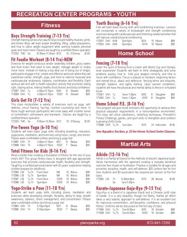 This class incorporates a variety of exercises such as yoga, selfdefense, circuit training, hip-hop, nutrition counseling and more. In these tough workouts participants will come away with a better sense of commitment, self-esteem and teamwork. Classes are taught by a certified fitness specialist. 172303 TMC Sa