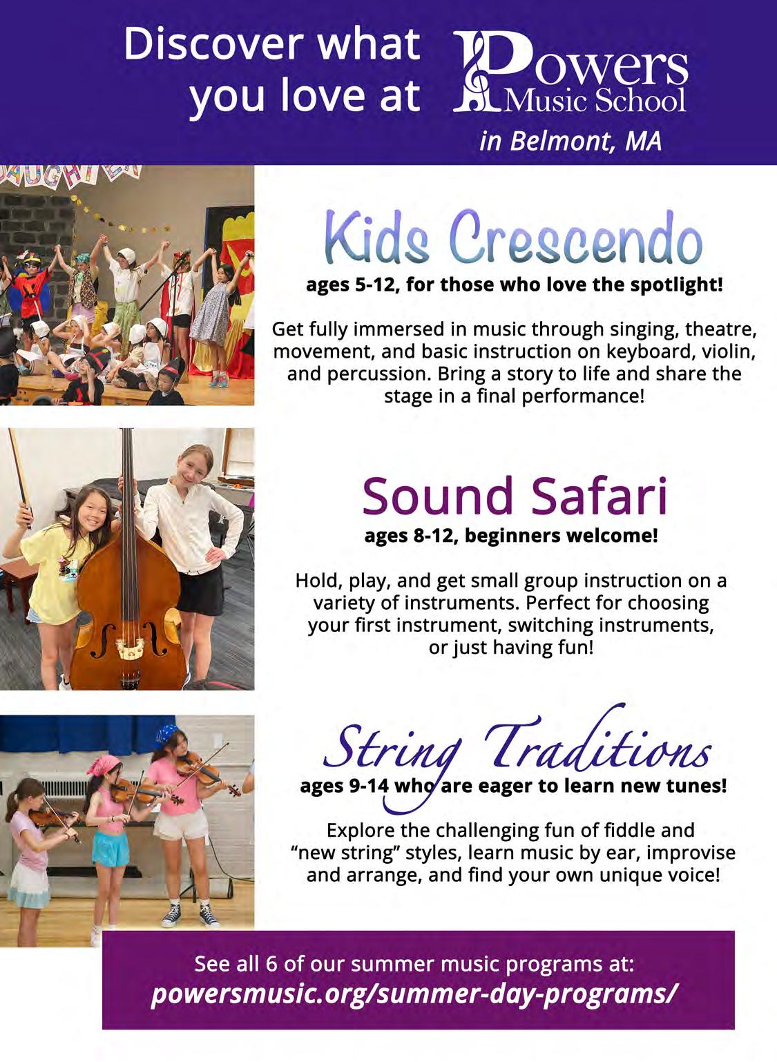 and unique learning opportunities not available during the school year. Kids interested in music, singing and performing can start in our popular Kids Crescendo program or Opera Kids. Ages 8-12 who are new to music or interested in switching instruments can choose Sound Safari. Suzuki violin students will have fun continuing their studies with their friends at Suzuki on the Hill. String players will love learning new tunes at String Traditions. Intermediate and advanced students can learn technical skills and participate in a variety of chamber music and ensembles at Music on the Hill.